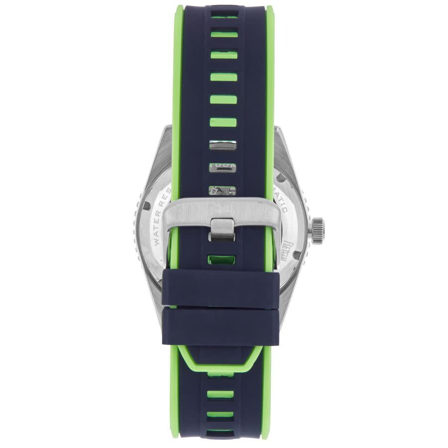 Band Color: Black Rubber; Band Width: 22mm near case; 22mm near clasp/buckle; Bezel Color: Black; Case: Silver + Circle-Shaped; Case Finish: Brushed + Stainless Steel; Case Thickness: 14mm; Case Width: 42mm; 45mm with Crown; Clasp / Buckle: Strap Buckle; Dial: Black + Analog; Hand Color: Silver; Movement: Japanese + Automatic; Time Zones: Single; Water Resistance: 10 ATM.