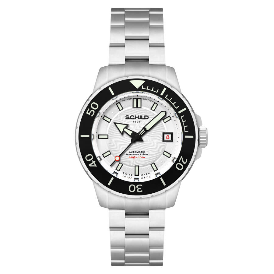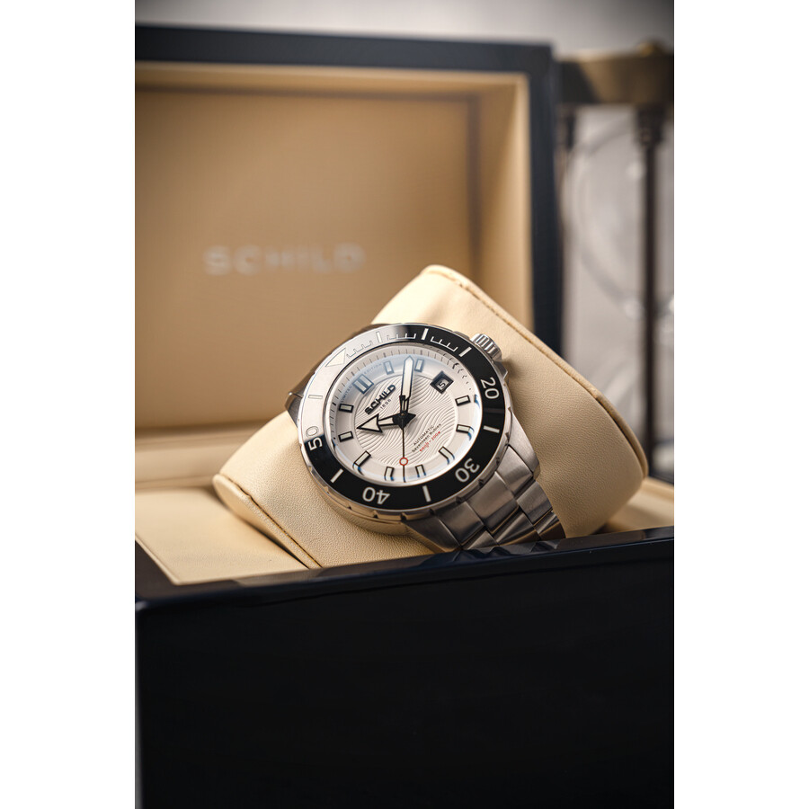 Silver-tone stainless steel case and bracelet. Uni-directional rotating black stainless steel bezel. White dial with black hands and index hour markers. Minute markers around the outer rim. Dial Type: Analog. Luminescent hands and markers. Date display at the 3 o'clock position. AS - 5203 automatic movement. Scratch resistant sapphire crystal. Screw down crown. Solid case back. Round case shape, case size: 43 mm, case thickness: 15 mm. Band width: 20 mm, band length: 8 inches. Fold over clasp with a safety release. Water resistant at 200 meters / 660 feet. Functions: date, hour, minute, second. Hermann Series. Casual watch style. Watch label: Swiss Made. Schild Hermann Automatic White Dial Men's Watch SC-1016-55.