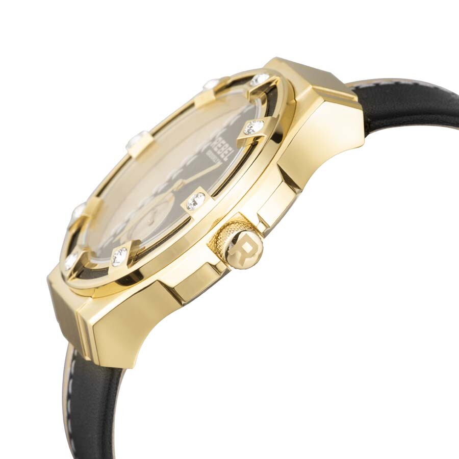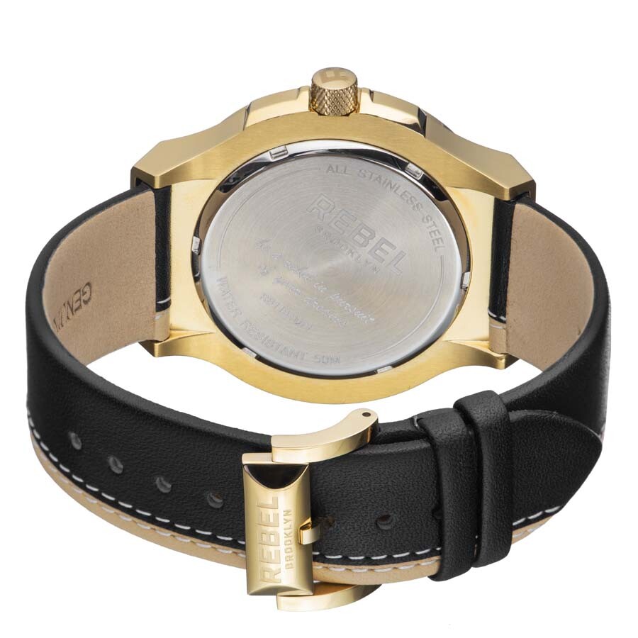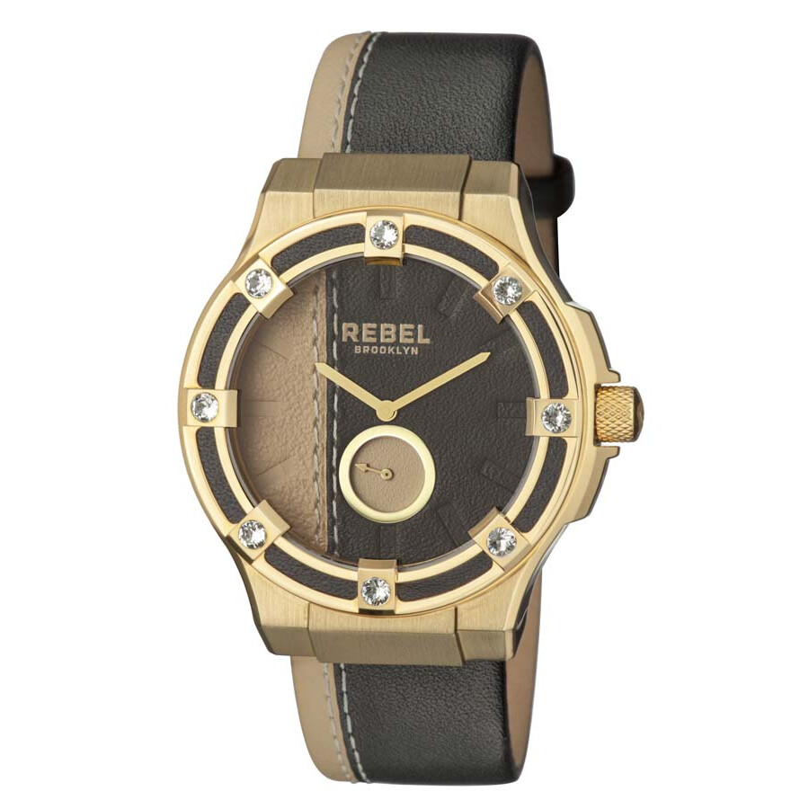 Gold-tone stainless steel case with a black and gold leather strap. Fixed gold-tone stainless steel bezel. Black and gold dial with gold-tone hands and index hour markers. Dial Type: Analog. One - 60 seconds subdial. Quartz movement. Scratch resistant mineral crystal. Push/pull crown. Solid case back. Round case shape, case size: 44 mm, case thickness: 11 mm. Band width: 23 mm, band length: 7.5 inches. Tang clasp. Water resistant at 50 meters / 165 feet. Functions: hour, minute, second. Casual watch style. Rebel Flatbush Ladies Watch RB119-9071.