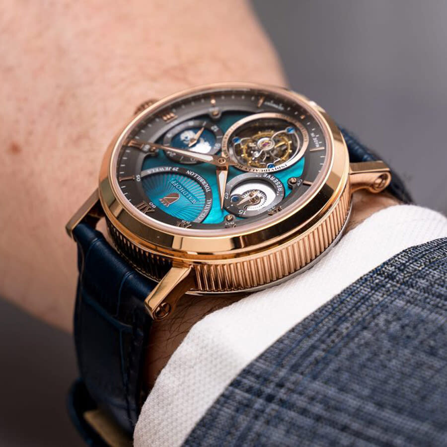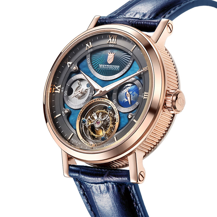Rose gold-tone stainless steel case with a blue calfskin band. Fixed rose gold-tone stainless steel bezel. Grey dial with rose gold-tone hands and Roman numeral & index hour markers. Minute markers around the outer rim. Dial Type: Analog. Luminescent hands. Power reserve, 24 hour, tourbillons subdials. Peacock 5211 Tourbillon hand wind movement. Scratch resistant sapphire crystal. Pull / push crown. Transparent case back. Round case shape, case size: 42.5 mm, case thickness: 12 mm. Band width: 22 mm. Deployment with push button release clasp. Water resistant at 30 meters / 100 feet. Functions: power reserve, hour, minute. Additional Info: freshwater pearl dial. Ultramatic Limited Series. Luxury watch style. Waldhoff Ultramatic Limited Hand Wind Grey Dial Men's Watch MW-05FM.