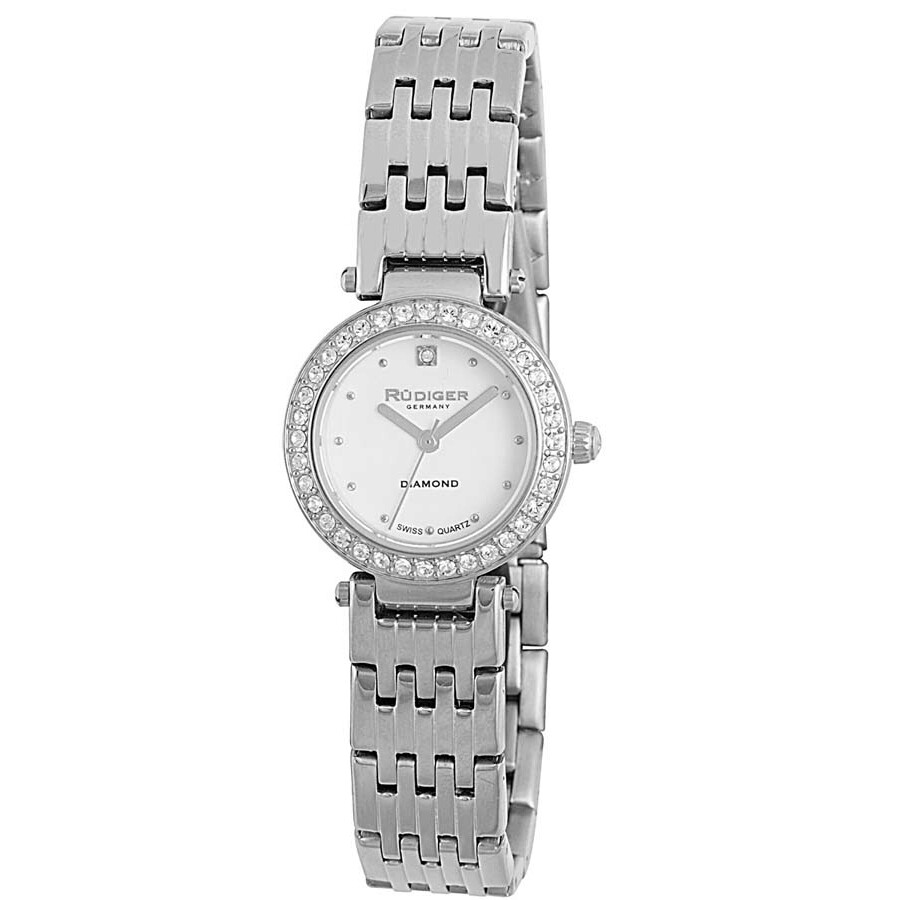 Silver-tone stainless steel case with a silver stainless steel bracelet. Fixed silver-tone stainless steel bezel. White dial with silver-tone hands and index hour markers. Dial Type: Analog. Quartz movement. Scratch resistant mineral crystal. Push/pull crown. Solid case back. Round case shape, case size: 26 mm, case thickness: 8 mm. Band width: 14 mm, band length: 7.5 in. Fold over clasp. Water resistant at 30 meter / 99 feet. Functions: hour, minute, second. Casual watch style. Rudiger Essen White Dial Ladies Watch R2500-04-009.