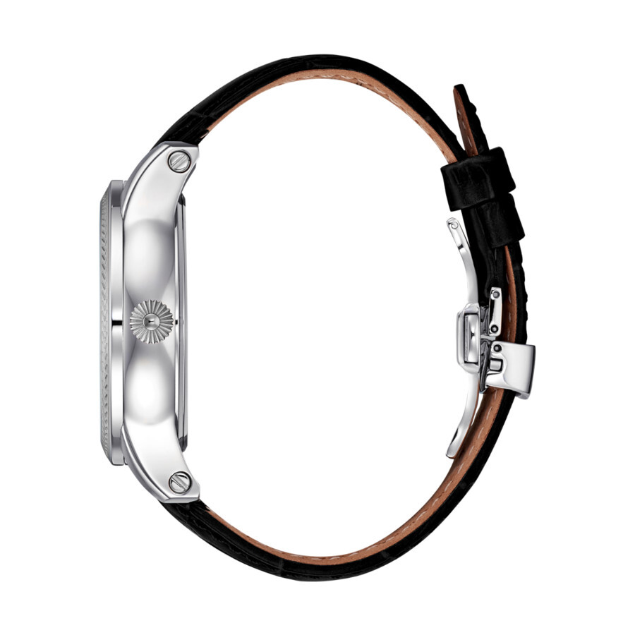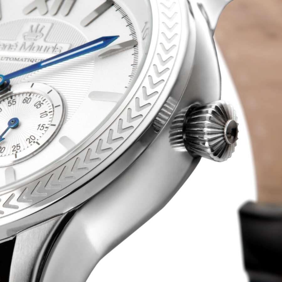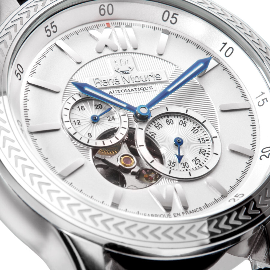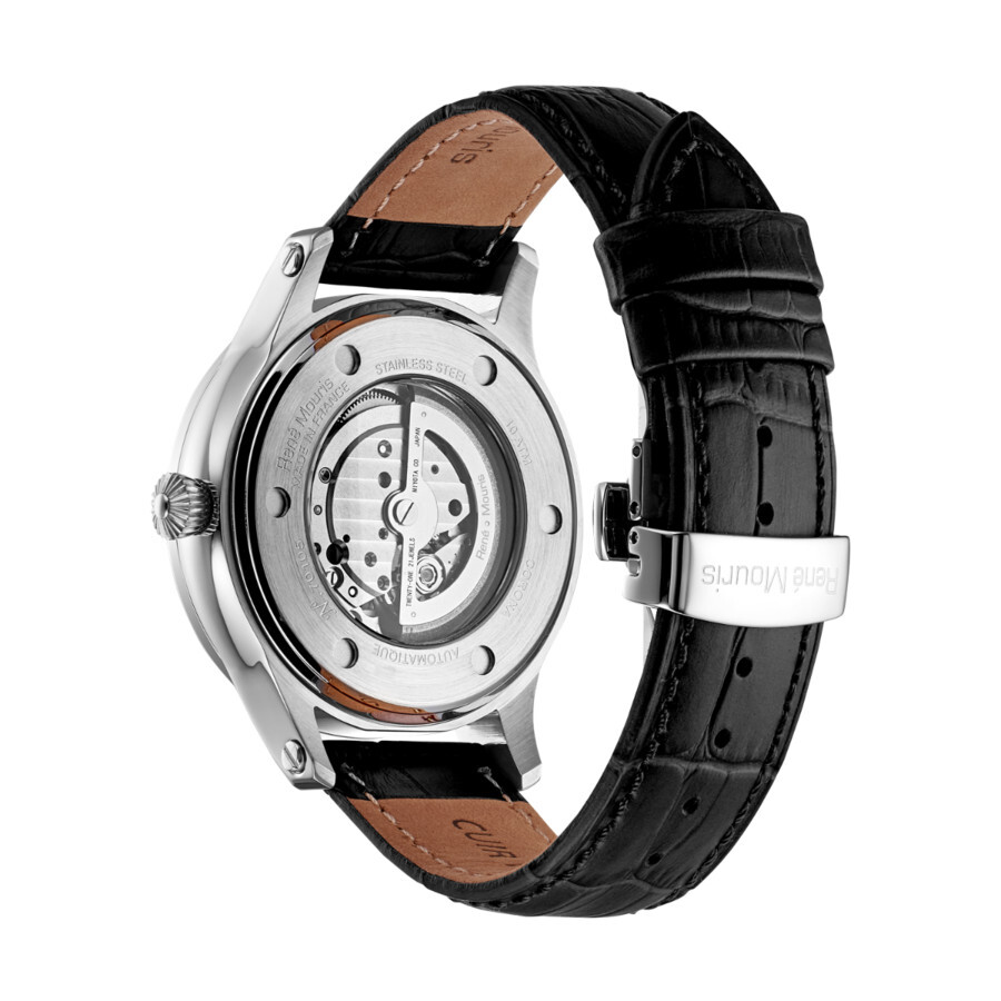 Stainless steel case with a black leather strap. Fixed stainless steel bezel. White (open heart) dial with luminous blue hands and index hour markers. Roman numerals appear at the 6 and 12 o'clock positions. Minute markers. Arabic numeral minute markers around the outer rim. Dial Type: Analog. Luminescent hands. Chronograph - two sub-dials displaying: 24 hour and 60 seconds. Automatic movement. Scratch resistant mineral crystal. Pull / push crown. Transparent case back. Round case shape, case size: 44 mm. Case thickness: 13 mm. Band width: 22 mm. Band length: 8.27 inches. Deployment clasp with a push button release. Water resistant at 100 meters / 330 feet. Functions: chronograph, hour, minute, second. Corona Series. Luxury watch style. Rene Mouris Corona Automatic White Dial Men's Watch 70105RM1.