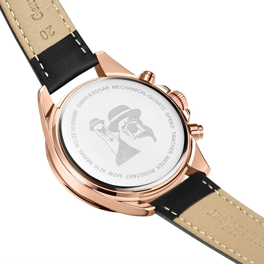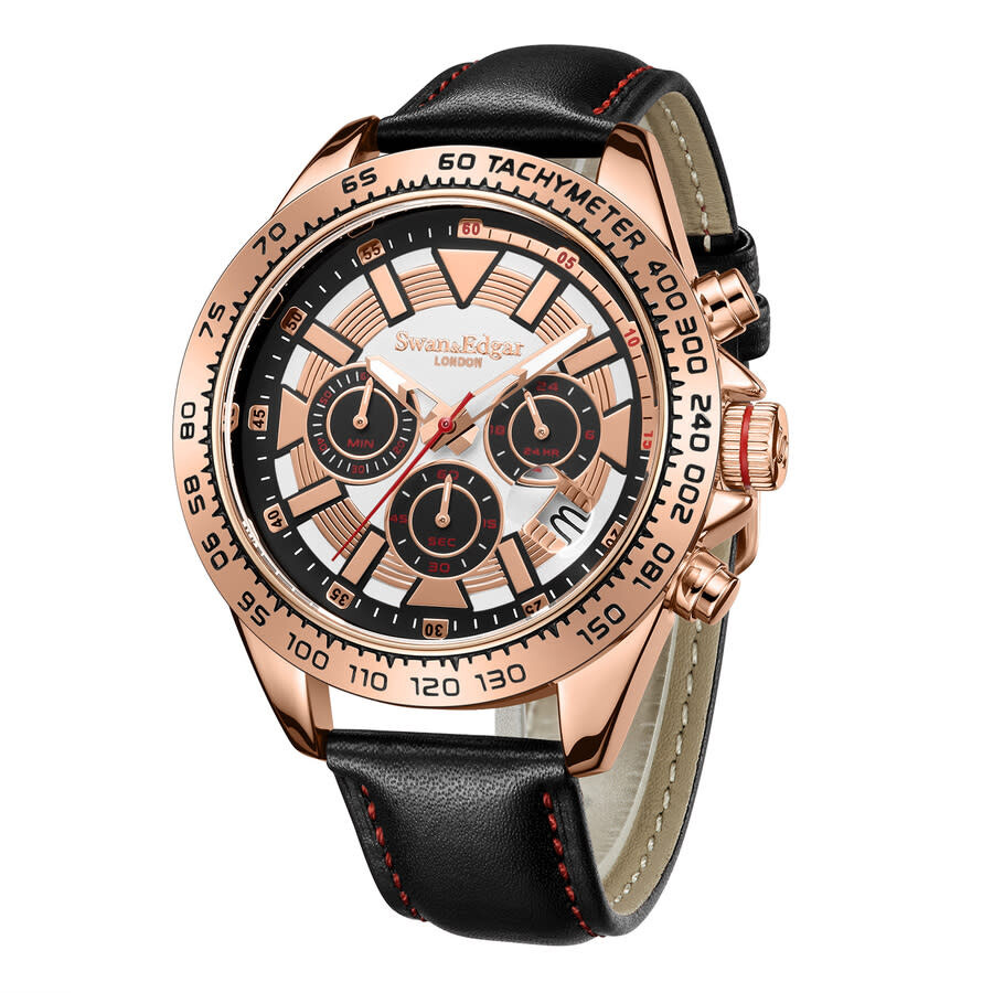 Rose gold-tone stainless steel case with a black leather strap. Fixed tachymeter scale rose gold-tone stainless steel bezel. White dial with rose gold-tone hands and index hour markers. Minute markers around the outer rim. Dial Type: Analog. Luminescent hands and markers. Date display between 4 and 5 o'clock position. Chronograph - sub-dials displaying: 60 minute. Automatic movement. Scratch resistant mineral crystal. Solid case back. Round case shape, case size: 45 mm, case thickness: 15 mm. Band width: 20 mm, band length: 7.75 inches. Water resistant at 30 meters / 100 feet. Functions: chronograph, date, hour, minute, second. Speed Tracker Series. Luxury watch style. Swan Edgar Speed Tracker Chronograph Automatic White Dial Men's Watch SE2002.