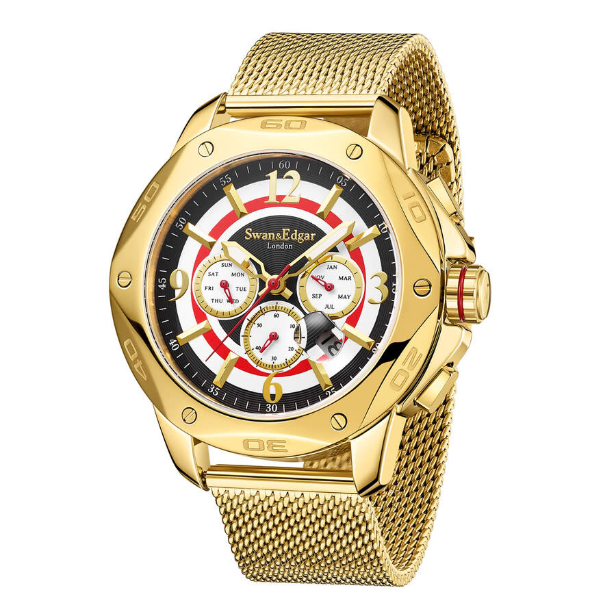 Yellow gold-tone stainless steel case and bracelet. Fixed yellow gold-tone stainless steel bezel. White dial with yellow gold-tone hands and Arabic numeral & index hour markers. Minute markers around the outer rim. Dial Type: Analog. Luminescent hands. Date display between 4 and 5 o'clock position. 60 minute subdials. Automatic movement. Scratch resistant mineral crystal. Solid case back. Round case shape, case size: 47 mm, case thickness: 15 mm. Band width: 20 mm, band length: 7.5 inches. Fold over clasp with a safety release. Water resistant at 30 meters / 100 feet. Functions: month, date, day, hour, minute, second. Sports Target Series. Sport watch style. Swan Edgar Sports Target Automatic White Dial Men's Watch SE1602.