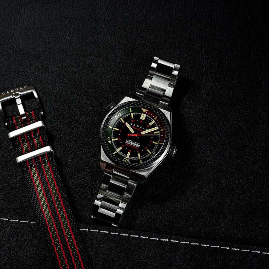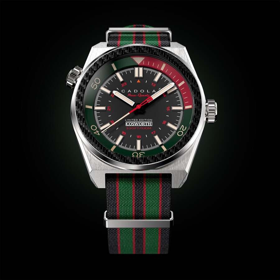 The Costin series from the Cosworth x Cadola range is a sparkling collection of timepieces that inhabit both the spirit and the precision of race-bound watches. This meca-quartz limited edition features the unique Seiko TMI built hybrid movement which delivers the best of quartz precision with the sweep charm and character of a mechanical timepiece. Silver-tone stainless steel case and bracelet. Fixed silver-tone stainless steel bezel. Black dial with silver-tone hands and index hour markers. Minute markers around the outer rim. Dial Type: Analog. Luminescent hands and markers. Seiko - VH31 quartz movement. Scratch resistant mineral crystal. Pull / push crown. Solid case back. Round case shape, case size: 42 mm, case thickness: 14 mm. Band width: 20 mm, band length: 8 inches. Fold over clasp. Water resistant at 100 meters / 330 feet. Functions: hour, minute, second. Costin Series. Casual watch style. Cadola Costin Black Dial Men's Watch CD-1039-22.
