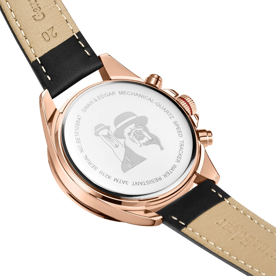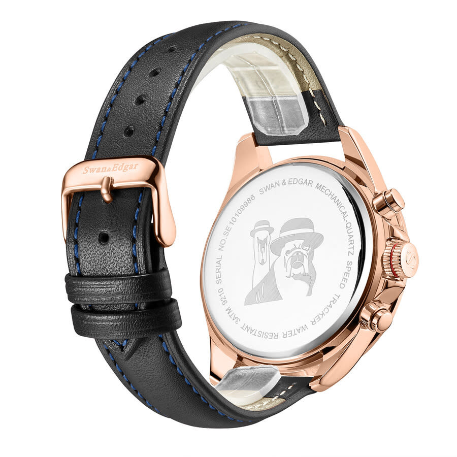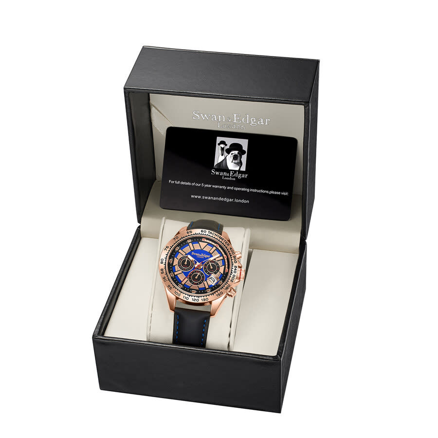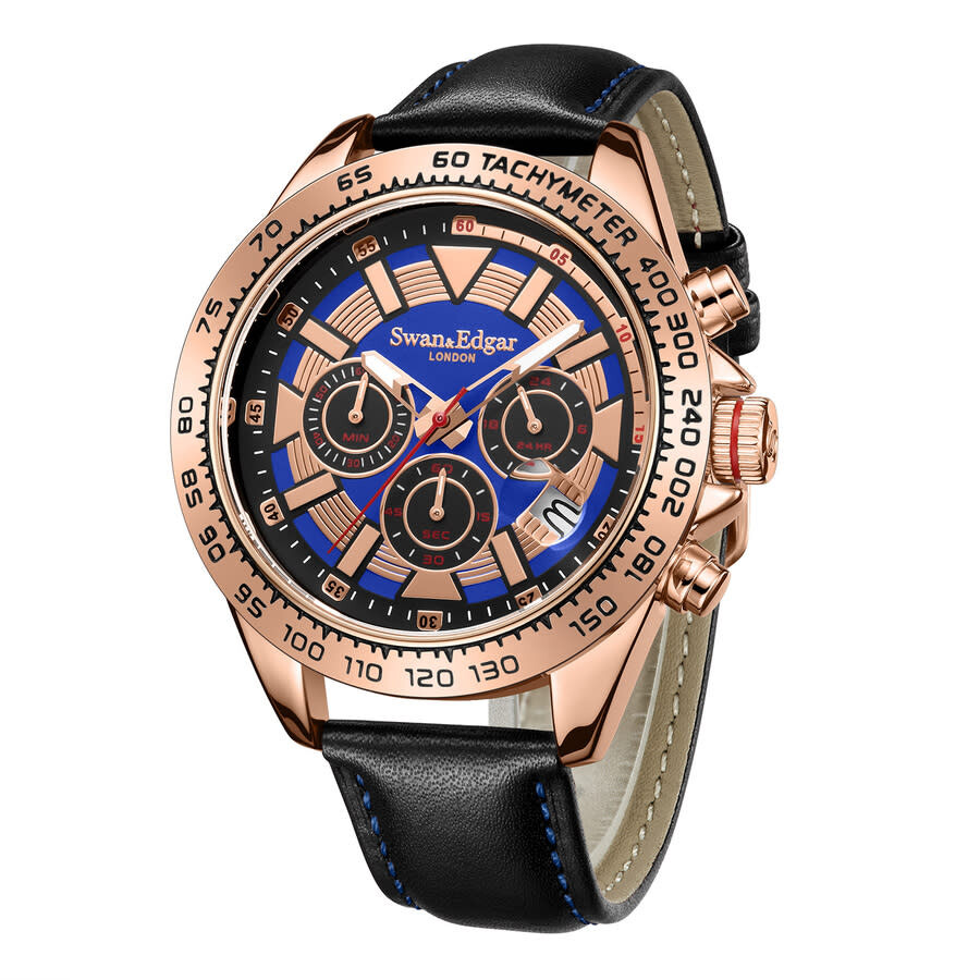 Rose gold-tone stainless steel case with a black leather strap. Fixed tachymeter scale rose gold-tone stainless steel bezel. Blue dial with rose gold-tone hands and index hour markers. Minute markers around the outer rim. Dial Type: Analog. Luminescent hands and markers. Date display between 4 and 5 o'clock position. Chronograph - sub-dials displaying: 60 minute. Automatic movement. Scratch resistant mineral crystal. Solid case back. Round case shape, case size: 45 mm, case thickness: 15 mm. Band width: 20 mm, band length: 7.75 inches. Water resistant at 30 meters / 100 feet. Functions: chronograph, date, hour, minute, second. Speed Tracker Series. Luxury watch style. Swan Edgar Speed Tracker Chronograph Automatic Blue Dial Men's Watch SE2000.