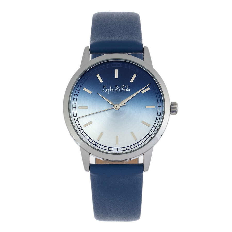 Silver-tone alloy case with a blue genuine leather strap. Fixed silver-tone alloy bezel. Blue dial with silver-tone hands and index hour markers. Minute markers around the outer rim. Dial Type: Analog. Quartz movement. Scratch resistant mineral crystal. Pull / push crown. Solid case back. Round case shape, case size: 36 mm, case thickness: 9 mm. Band width: 18 mm. Buckle clasp. Water resistant at 30 meters / 100 feet. Functions: hour, minute, second. Watch label: Japan Movt. Item Variations: SAFSF5102. Sophie And Freda San Diego Quartz Blue Dial Ladies Watch SF5102.