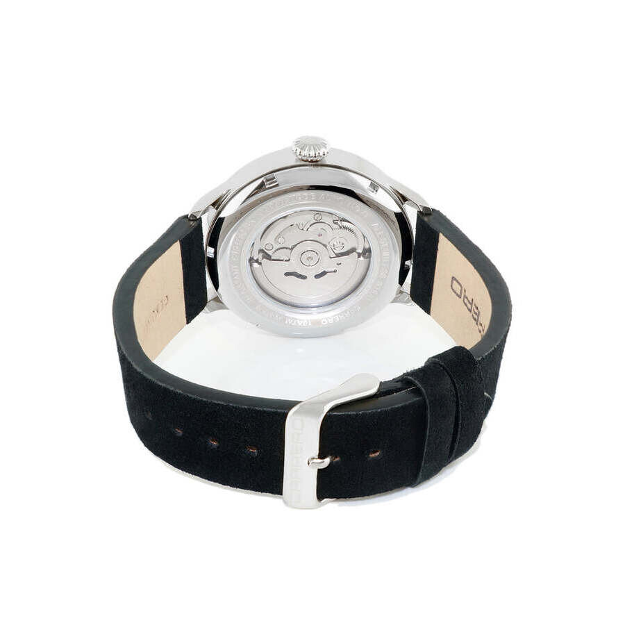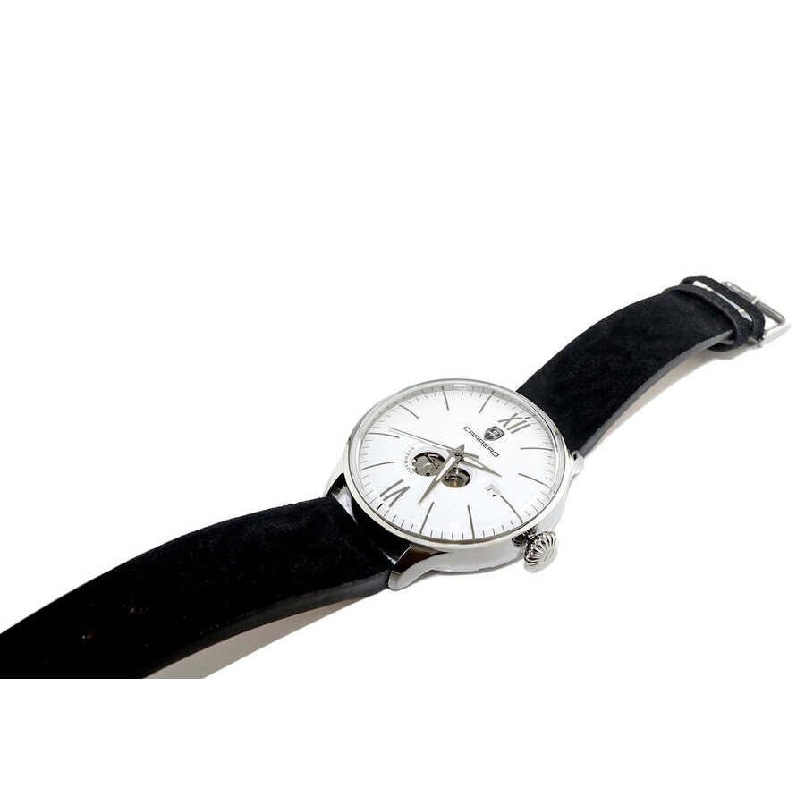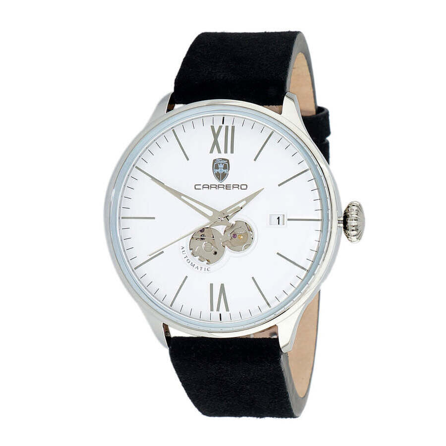 TORINO CARRERO MEN'S WATCH, NH35 (24-JEWELS AUTOMATIC) WITH EXHIBITION BACK, OPEN HEART BEAT CURVE WHITE DIAL, STAINLESS STEEL CASE SILVER TONE, BLACK GENUINE LEATHER BAND Silver-tone stainless steel case with a black genuine leather strap. Fixed silver-tone stainless steel bezel. White dial with silver-tone hands and Roman numeral & index hour markers. Minute markers around the outer rim. Dial Type: Analog. Luminescent hands. Date display at the 3 o'clock position. TMI Caliber NH35 Automatic movement, containing 24 Jewels, bitting at 21600 vph, and has a power reserve of approximately 41 hours. Scratch resistant mineral crystal. Pull / push crown. Transparent case back. Round case shape, case size: 45 mm, case thickness: 15.25 mm. Band width: 22 mm, band length: 7.5 inches. Buckle clasp. Water resistant at 100 meters / 330 feet. Functions: date, hour, minute, second. Additional Info: open heart. Aerodrome Series. Dress watch style. Watch label: Japan Movt. Torino Carrero Aerodrome Automatic White Dial Men's Watch C1S1780-WTJ.
