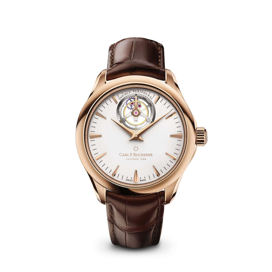 18k rose gold case with a brown alligator leather strap. 18k rose gold bezel. Silver dial with rose gold-tone hands and index hour markers. Dial Type: Analog. Carl F. Bucherer Calibre T3000 automatic movement with a 65-hour power reserve. Scratch resistant sapphire crystal. Sapphire case back. Round case shape, case size: 43.1 mm. 18k rose gold folding pin buckle clasp. Water resistant at 30 meters / 100 feet. Functions: hour, minute. Manero Tourbillon Double Peripheral Series. Luxury watch style. Watch label: Swiss Made. Carl F. Bucherer Manero Tourbillon Double Peripheral Automatic Silver Dial Men's Watch 00.10920.03.13.01.