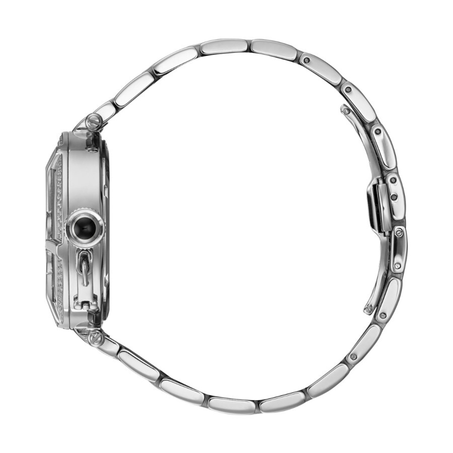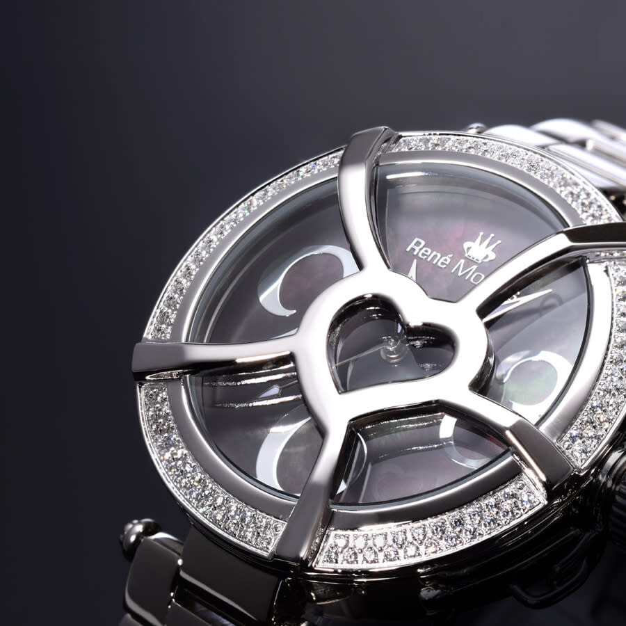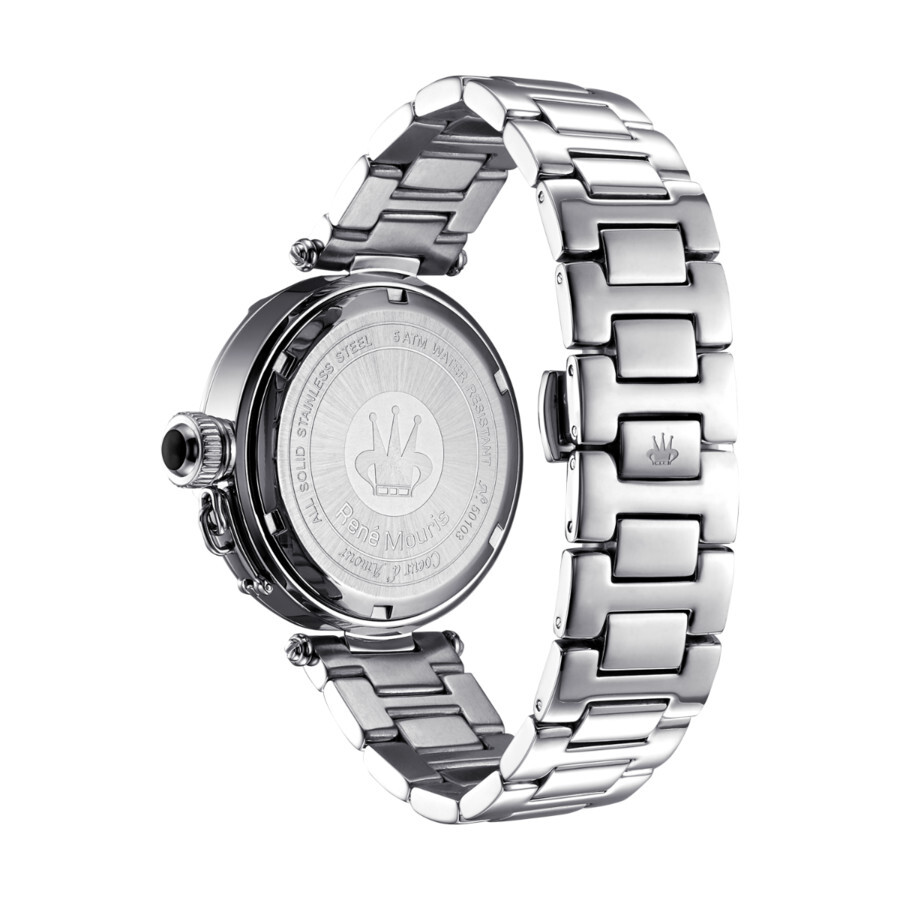 Coeur d'Amour by Rene Mouris is inspired by love and passion. This elegant and charming timepiece has a pink, white or black mother-of-pearl dial decorated with a motif of hearts. Premium crystals can be found edging the heart on some models, and also looping round the bezel. Stainless steel case with a stainless steel bracelet. Fixed stainless steel bezel set with crystals. Mother of pearl (heart motif) dial with silver-tone hands. Stylized arabic numerals at the 3, 6 and 9 o'clock positions. Dial Type: Analog. Quartz movement. Scratch resistant mineral crystal. Pull / push crown. Solid case back. Round case shape. Case size: 38 mm. Case thickness: 12 mm. Band width: 18 mm. Band length: 6.5 inches. Deployment clasp with a push button release. Water resistant at 50 meters / 165 feet. Functions: hour, minute, second. Coeur D'amour Series. Fashion watch style. Rene Mouris Coeur DAmour Mother of Pearl Dial Ladies Watch 50103RM3.