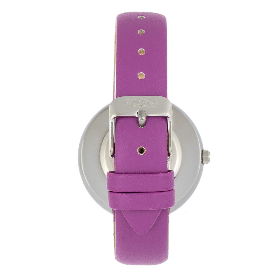 Silver-tone alloy case with a purple leatherette strap. Fixed silver-tone alloy bezel. White dial with red and orange hands. No markers. Dial Type: Analog. Quartz movement. Scratch resistant mineral crystal. Pull / push crown. Solid case back. Round case shape. Case size: 38 mm. Case thickness: 9 mm. Band width: 16 mm, band length: 8 inches. Tang clasp. Water resistant at 30 meters / 100 feet. Functions: hour, minute, second. Metric Series. Casual watch style. Crayo Metric Quartz White Dial Unisex Watch CRACR5803.