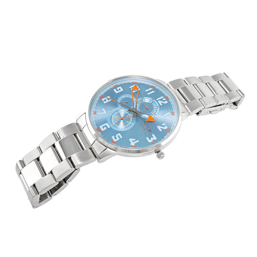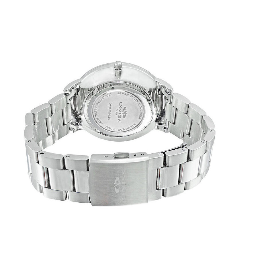 Silver-tone stainless steel case and bracelet. Fixed silver-tone stainless steel bezel. Blue dial with silver-tone hands and Arabic numeral hour markers. Minute scale around the inner rim. Dial Type: Analog. Luminescent hands and markers. Day / date. 24 hour subdials. VX3NE quartz movement. Scratch resistant mineral crystal. Pull / push crown. Solid case back. Round case shape, case size: 45 mm, case thickness: 10.5 mm. Band width: 22 mm, band length: 7.25 inches. Fold over with double push button release clasp. Water resistant at 50 meters / 165 feet. Functions: date, day, hour, minute, second. On1818 Series. Fashion watch style. Watch label: Japan Movt. Oniss ON1818 Quartz Blue Dial Men's Watch ONJ1818-MLBU.