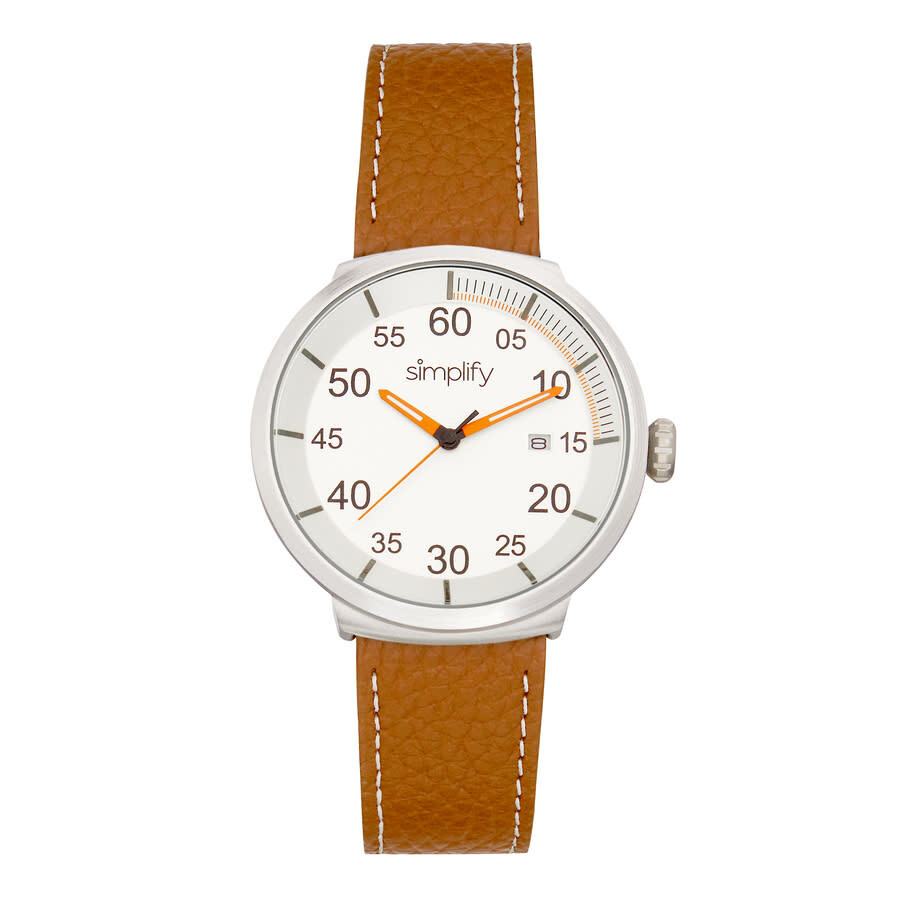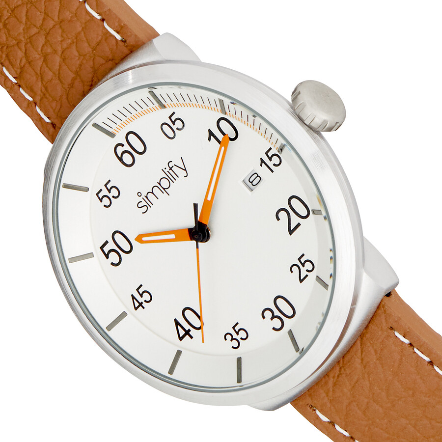 Silver-tone alloy case with a brown leather strap. Fixed silver-tone alloy bezel. White dial with luminous orange hands and index hour markers. Arabic numeral minute markers (at 5 minute intervals). Dial Type: Analog. Luminescent hands. Date display at the 3 o'clock position. Quartz movement. Scratch resistant mineral crystal. Pull / push crown. Solid case back. Round case shape. Case size: 42 mm. Case thickness: 11 mm. Band width: 20 mm. Band length: 8.5 inches. Tang clasp. Water resistant at 30 meters / 100 feet. Functions: date, hour, minute, second. The 7100 Series. Casual watch style. Watch label: Japan Movt. Simplify The 7100 Quartz White Dial Brown Leather Watch SIM7102.