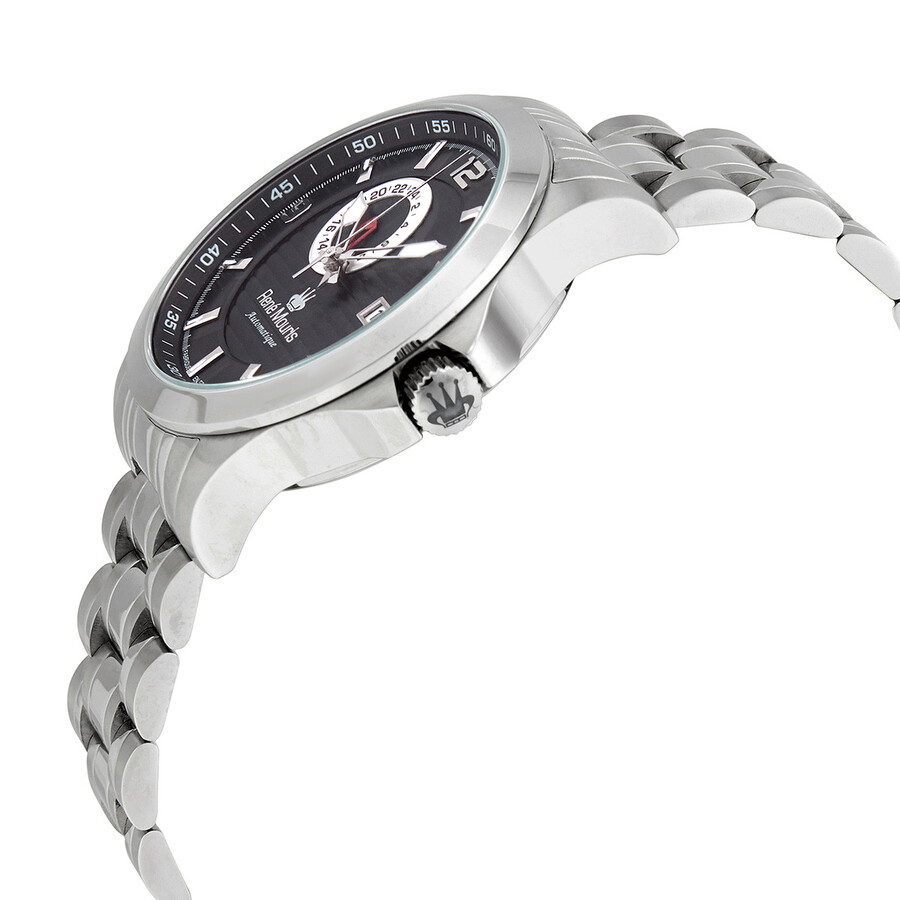 Stainless steel case with a stainless steel bracelet. Fixed stainless steel bezel. Black dial with luminous silver-tone hands and index hour markers. Arabic numerals appear at the 3, 9 and 12 o'clock positions. Minute markers. Arabic numeral minute markers (at 5 minute intervals) around the outer rim. Dial Type: Analog. Luminescent hands and markers. Date display at the 3 o'clock position. 24 hour sub-dial. Automatic movement. Scratch resistant mineral crystal. Pull / push crown. Transparent case back. Round case shape. Case size: 44 mm. Case thickness: 13 mm. Band width: 22 mm. Band length: 7.87 inches. Deployment with push button release clasp. Water resistant at 100 meters / 330 feet. Functions: hour, minute, second, power reserve. Cygnus Series. Luxury watch style. Rene Mouris Cygnus Automatic Black Dial Men's Watch 70104RM2.