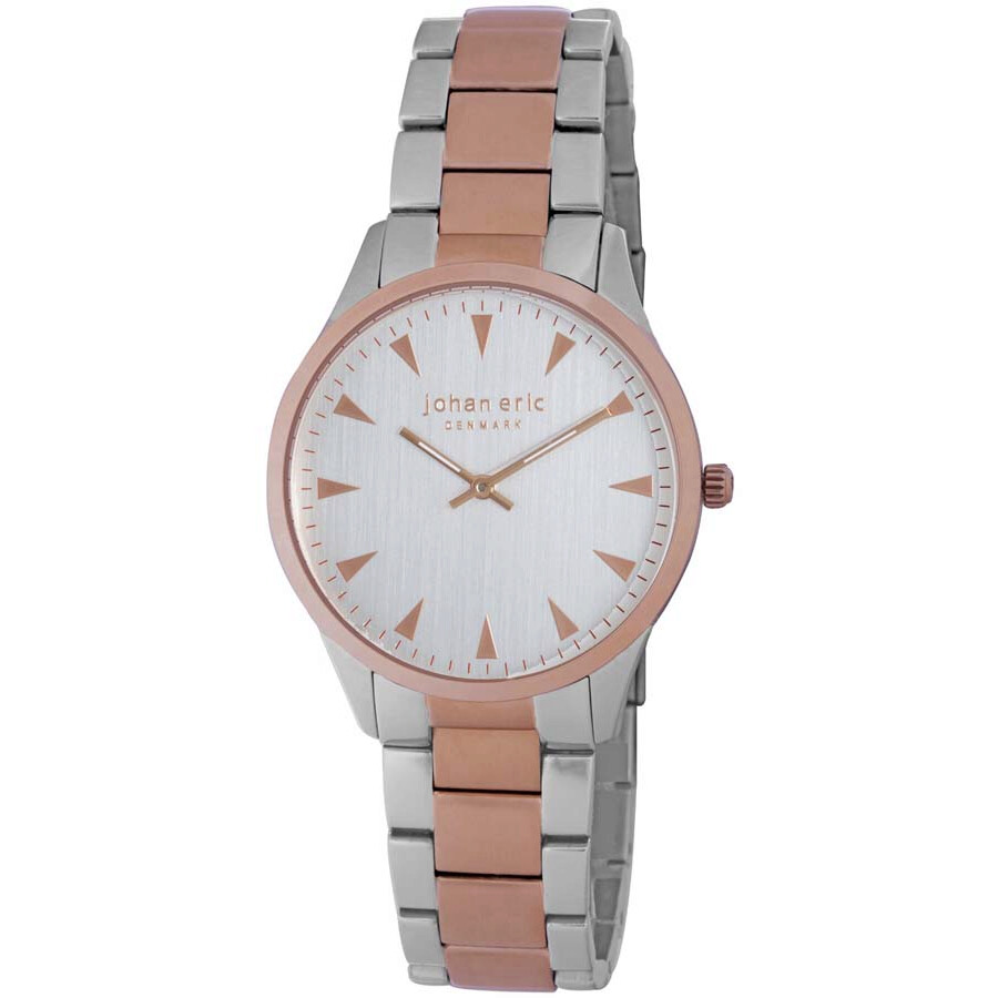 Silver-tone stainless steel case with a two-tones stainless steel bracelet. Fixed silver-tone stainless steel bezel. Silver dial with rose gold-tone hands and index hour markers. Dial Type: Analog. Miyota Caliber 2025 quartz movement. Scratch resistant mineral crystal. Push/pull crown. Solid case back. Round case shape, case size: 40 mm, case thickness: 8 mm. Band width: 19 mm, band length: 8.5 in. Fold over clasp. Water resistant at 50 meters / 165 feet. Functions: hour, minute. Casual watch style. Item Variations: JE9000 12 001B, JE9000.12.001B, JE900012001B. Johan Eric Helsingor Men's Watch JE9000-12-001B.