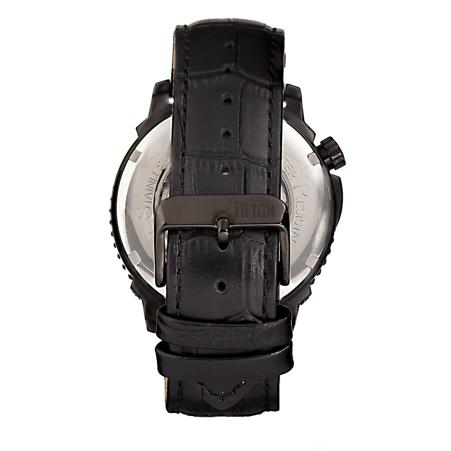 Black stainless steel case with a black genuine leather strap. Black stainless steel bezel. Black dial with black sword-shaped hands and index hour markers. Minute scale around the inner rim. Dial Type: Analog. Luminescent hands and markers. Automatic movement. Scratch resistant mineral crystal. Pull / push crown. Semi-transparent case back. Round case shape, case size: 44 mm, case thickness: 12 mm. Band width: 22 mm, band length: 9.75 inches. Buckle clasp. Water resistant at 50 meters / 165 feet. Functions: hour, minute, second. Casual watch style. Reign Bauer Automatic Black Dial Men's Watch REIRN6007.
