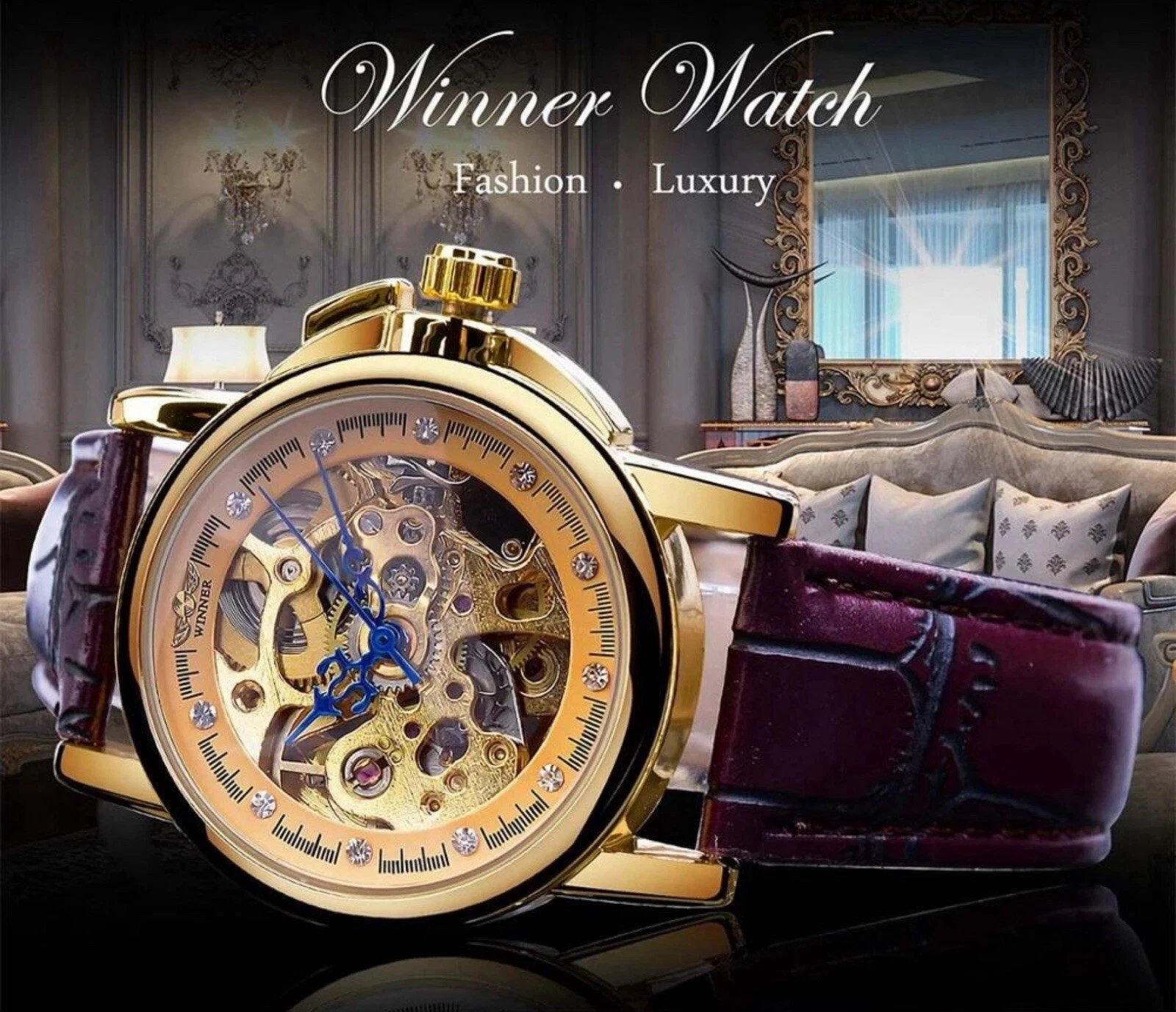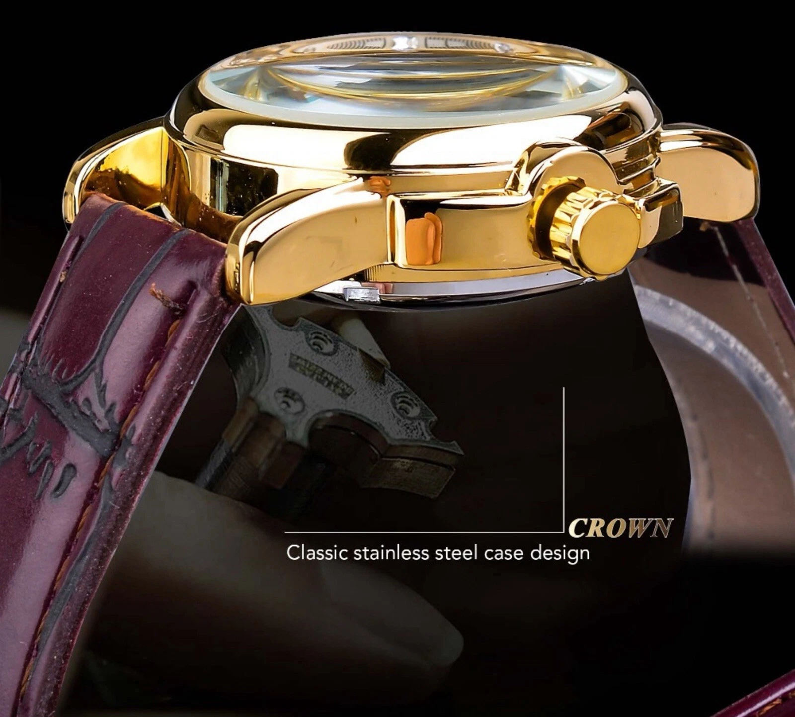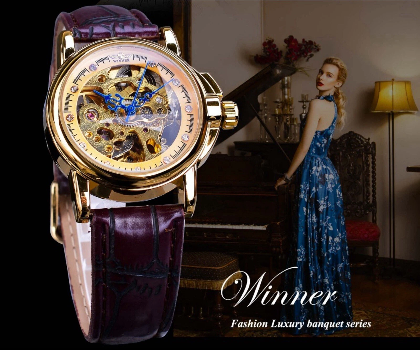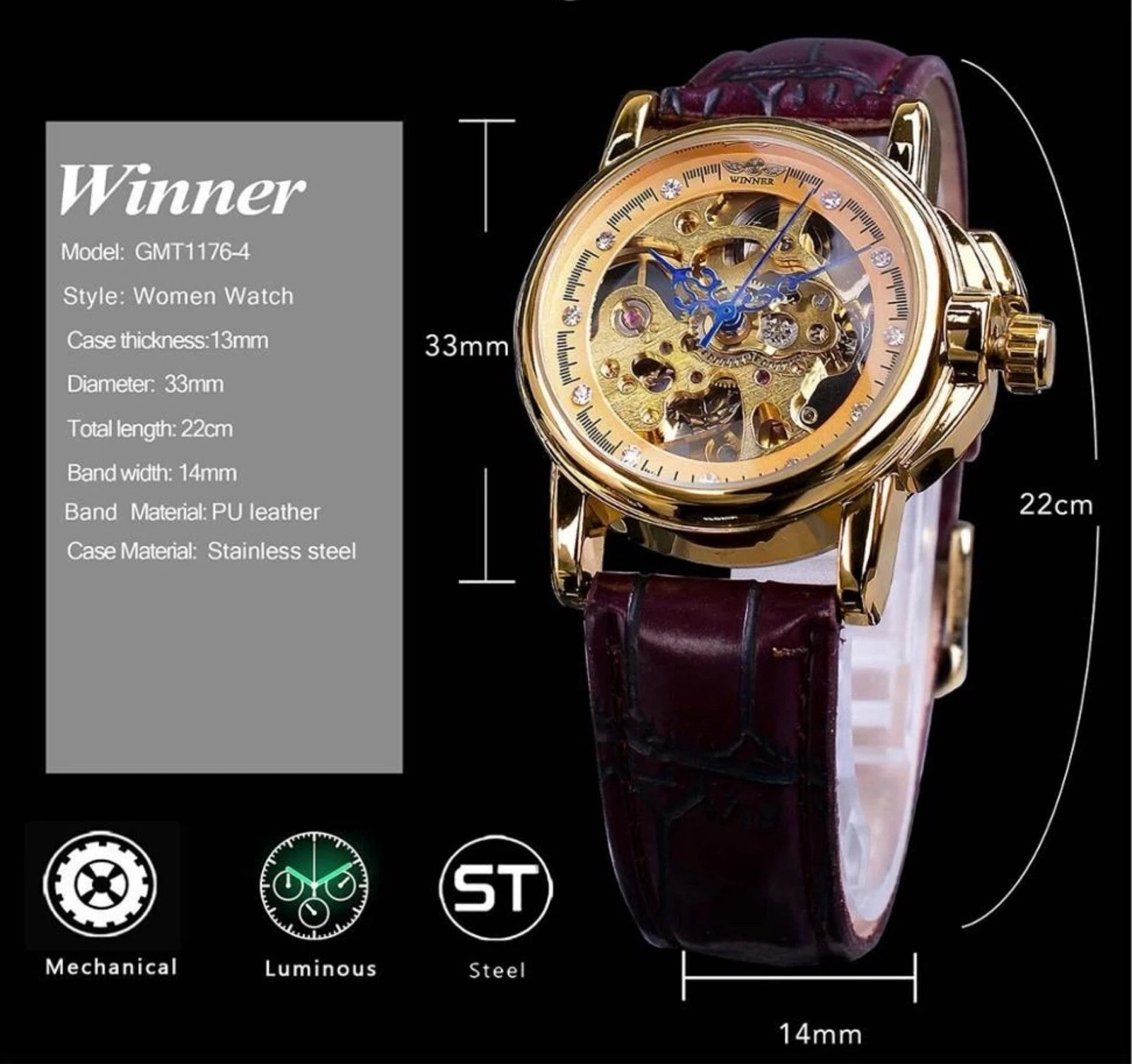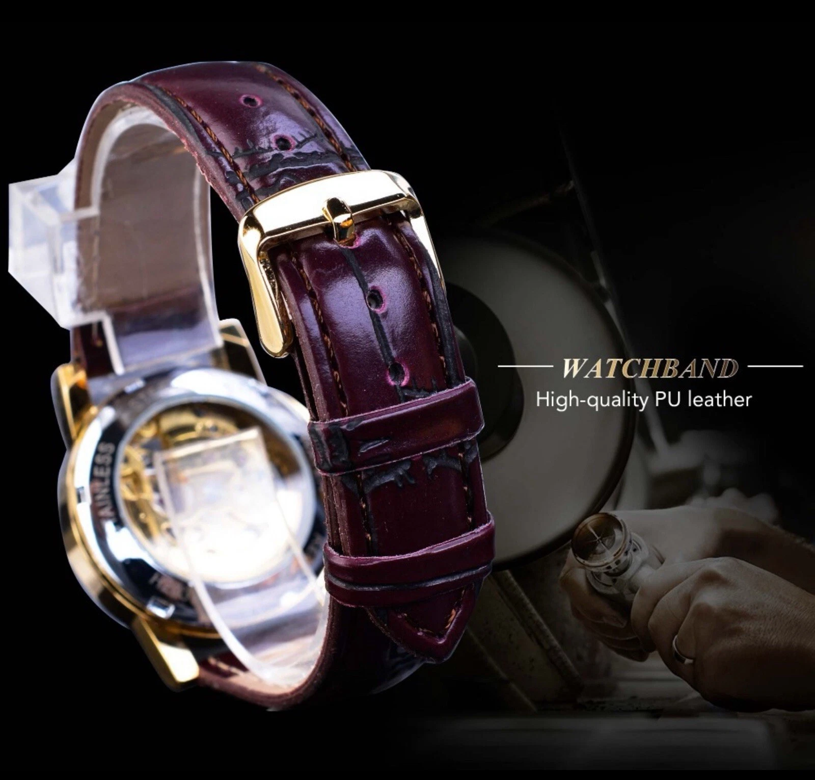 Womens Automatic Transparent Skeleton Luxury Leather Band Ladies Watch Gift Idea