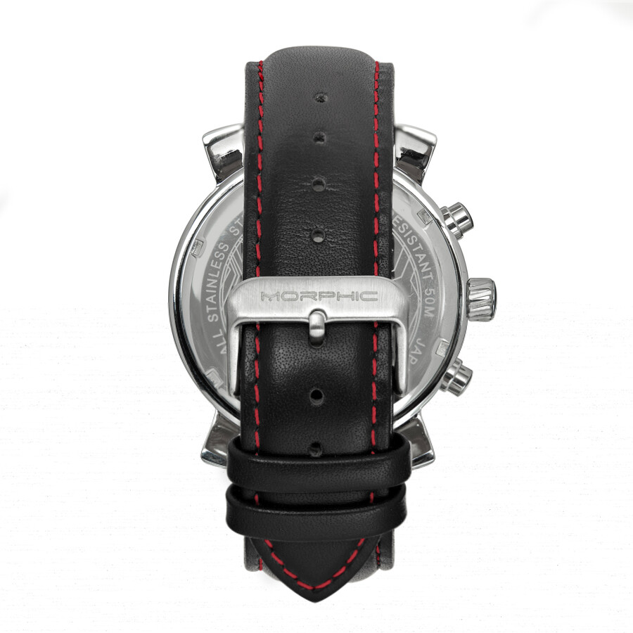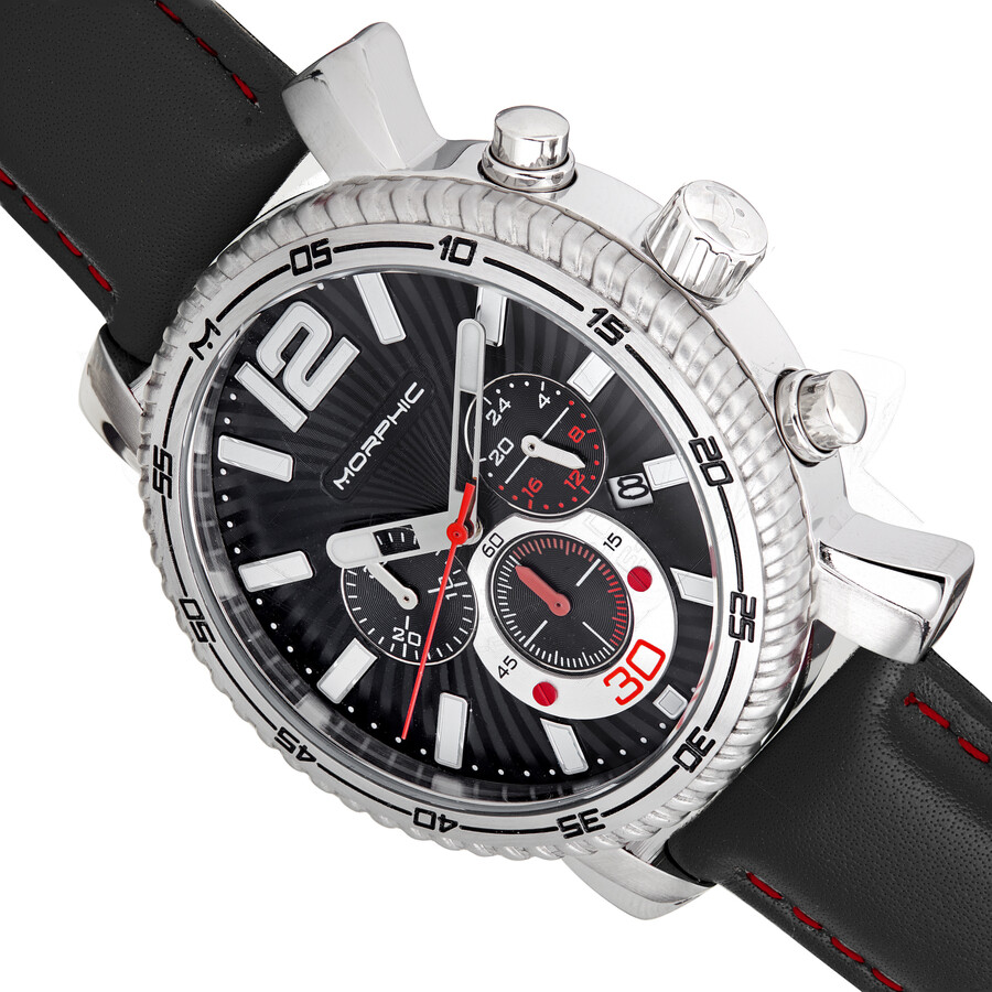 Stainless steel case with a black leather strap. Fixed stainless steel bezel. Black dial with luminous silver-tone hands and index hour markers. An Arabic numeral appears at the 12 o'clock positions. Minute markers around the outer rim. Dial Type: Analog. Luminescent hands and markers. Date display at the 4 o'clock position. Chronograph - three sub-dials displaying: 60 second, 30 minute and 24 hour. Quartz movement. Scratch resistant mineral crystal. Pull / push crown. Solid case back. Round case shape. Case size: 44 mm. Case thickness: 11 mm. Band width: 22 mm. Band length: 9 inches. Tang clasp. Water resistant at 50 meters / 165 feet. Functions: date, hour, minute, second. M89 Series Series. Casual watch style. Watch label: Japan Movt. Morphic M89 Series Quartz Black Dial Men's Watch MPH8902.