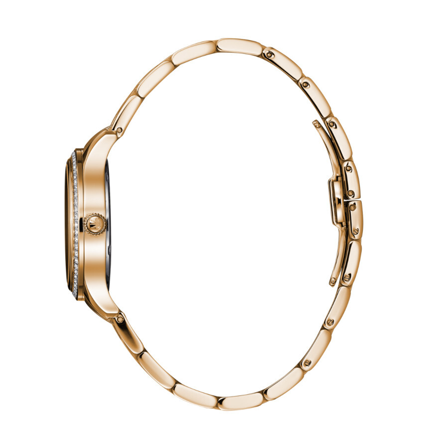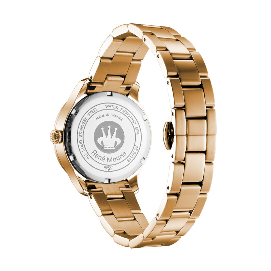 Lola is about a perpetual love once you in love with its elegant look and appealing personality. Rose gold PVD stainless steel case and bracelet. Fixed rose gold PVD stainless steel set with crystals bezel. Brown dial with rose gold-tone hands and index hour markers. A Roman numeral appear at the 12 o'clock position. Minute markers around the outer rim. Dial Type: Analog. Date display at the 3 o'clock position. Quartz movement. Scratch resistant mineral crystal. Pull / push crown. Solid case back. Round case shape. Case size: 34 mm. Case thickness: 9 mm. Band width: 16 mm. Deployment clasp with a push button release. Water resistant at 50 meters / 165 feet. Functions: date, hour, minute, second. Lola Series. Fashion watch style. Rene Mouris Lola Brown Dial Ladies Watch 50113RM4.