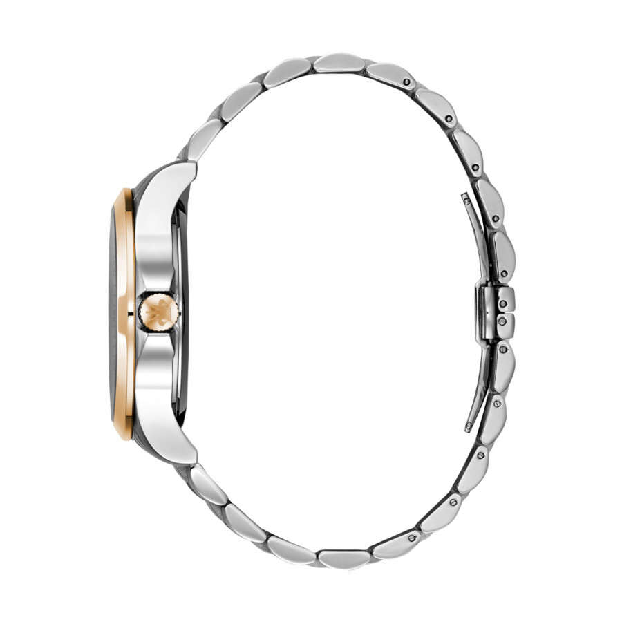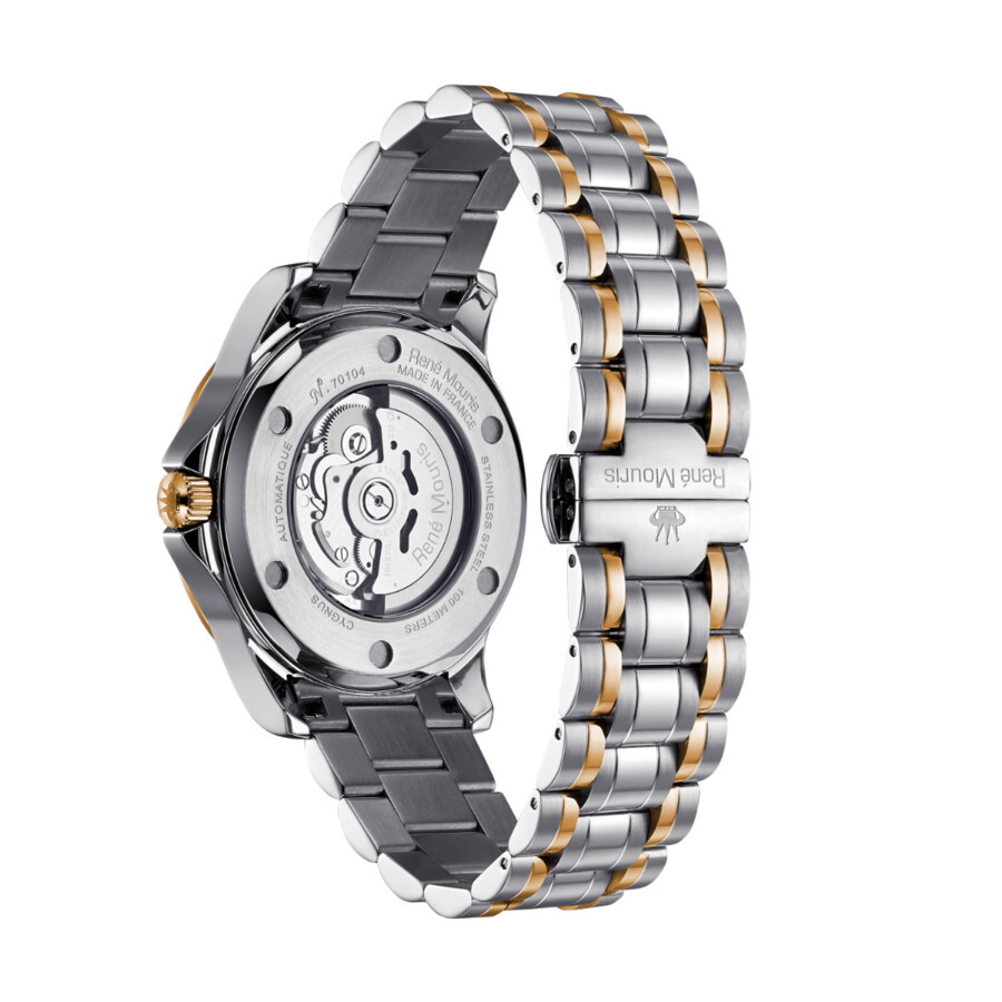 Rose gold-tone stainless steel case with a two-tone (silver-tone and rose gold-tone) stainless steel bracelet. Fixed rose gold-tone stainless steel bezel. White dial with rose gold-tone hands and Arabic numeral & index hour markers. Minute scale around the inner rim. Dial Type: Analog. Luminescent hands and markers. Date display at the 3 o'clock position. 24 hour subdials. Automatic movement. Scratch resistant mineral crystal. Pull / push crown. Transparent case back. Round case shape, case size: 44 mm, case thickness: 13 mm. Band width: 22 mm, band length: 7.87 inches. Deployment with push button release clasp. Water resistant at 100 meters / 330 feet. Functions: hour, minute, second, power reserve. Cygnus Series. Casual watch style. Rene Mouris Cygnus Automatic White Dial Men's Watch 70104RM4.