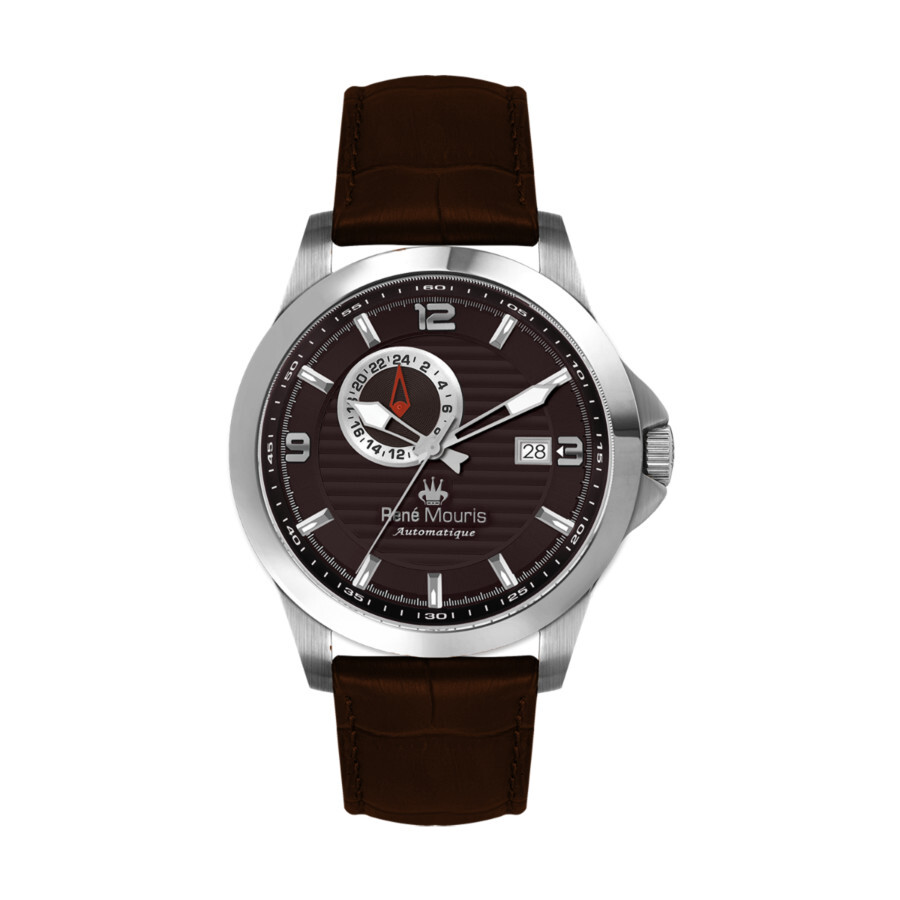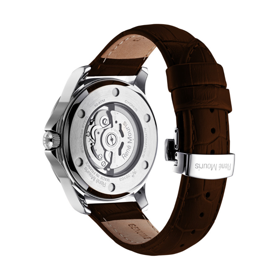 Silver-tone stainless steel case with a brown genuine leather strap. Fixed silver-tone stainless steel bezel. Brown dial with silver-tone hands and Arabic numeral & index hour markers. Minute scale around the inner rim. Dial Type: Analog. Luminescent hands and markers. Date display at the 3 o'clock position. 24 hour subdials. Automatic movement. Scratch resistant mineral crystal. Pull / push crown. Transparent case back. Round case shape, case size: 44 mm, case thickness: 13 mm. Band width: 22 mm, band length: 8.46 inches. Deployment with push button release clasp. Water resistant at 100 meters / 330 feet. Functions: hour, minute, second, power reserve. Cygnus Series. Dress watch style. Rene Mouris Cygnus Automatic Brown Dial Men's Watch 70103RM3.