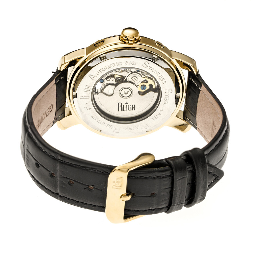 Gold-tone stainless steel case with a black leather strap. Fixed gold bezel. Black dial with gold-tone hands and Roman numeral hour markers. Minute markers around the outer rim. Dial Type: Analog. Luminescent hands. Automatic movement with a 42-hour power reserve. Scratch resistant mineral crystal. Transparent case back. Round case shape, case size: 45 mm, case thickness: 12 mm. Band width: 22 mm. Buckle clasp. Water resistant at 30 meters / 100 feet. Functions: hour, minute, second. Casual watch style. Item Variations: REIRN4305. Reign Kahn Automatic Black Dial Men's Watch REIRN4305.