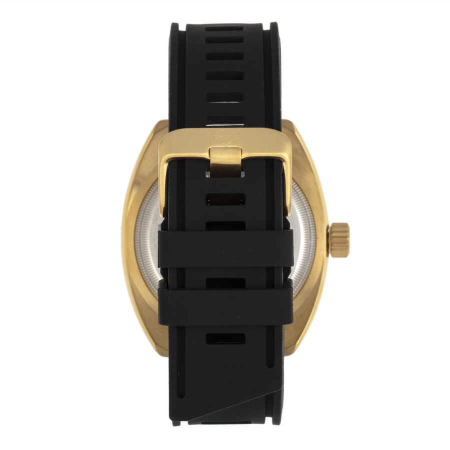 Gold-tone 316L surgical-quality stainless steel case with a black silicone strap. Uni-directional rotating black stainless steel bezel. Black dial with gold-tone hands and index hour markers. Dial Type: Analog. Luminescent hands and markers. Quartz movement. Scratch resistant mineral crystal. Screw down crown. Solid case back. Tonneau case shape, case size: 44 mm, case thickness: 15 mm. Band width: 22 mm. Buckle clasp. Water resistant at 200 meters / 660 feet. Functions: hour, minute, second. Dive watch style. Watch label: Japan Movt. Item Variations: SLDSH107-5. Shield Dreyer Quartz Black Dial Men's Watch SLDSH107-5.