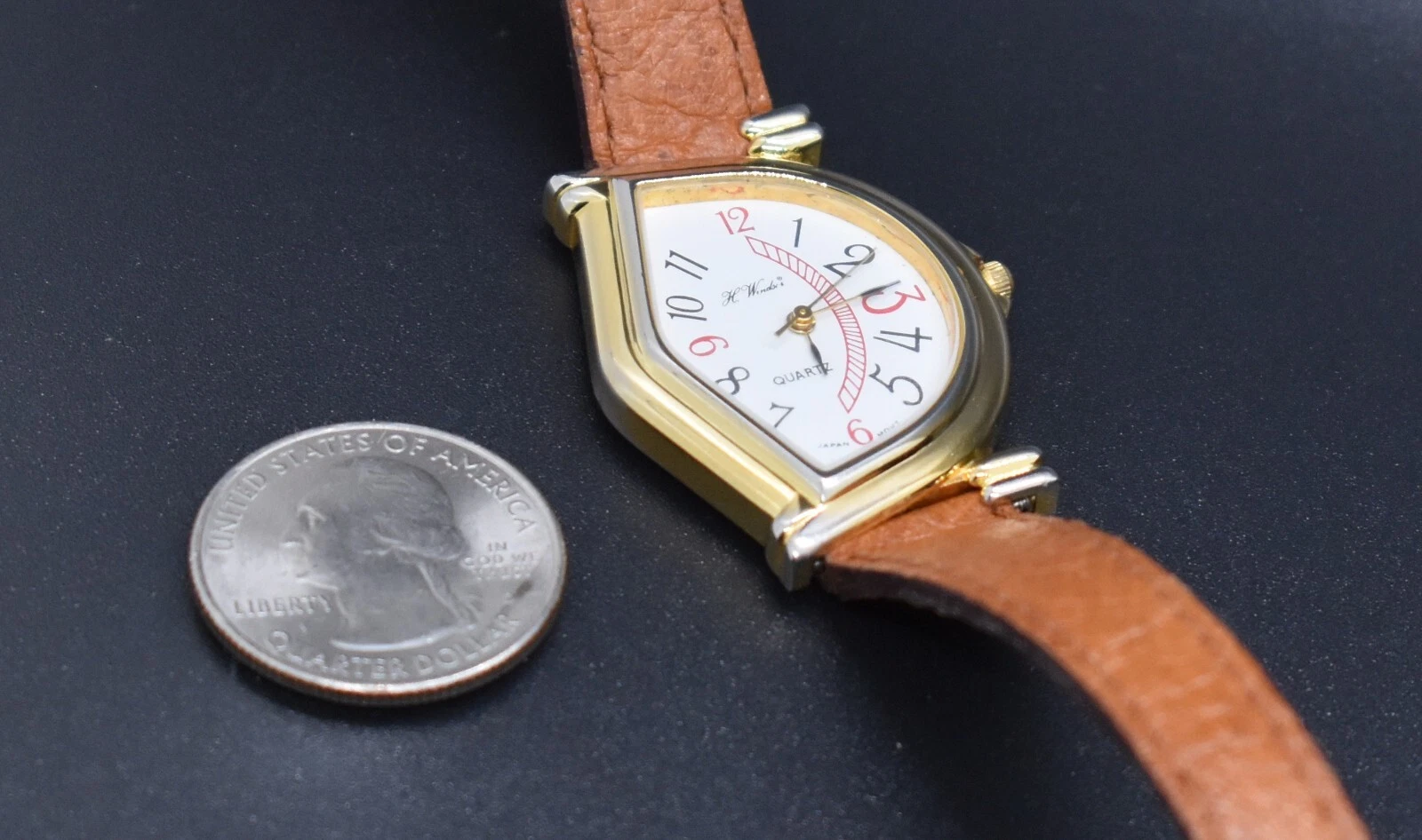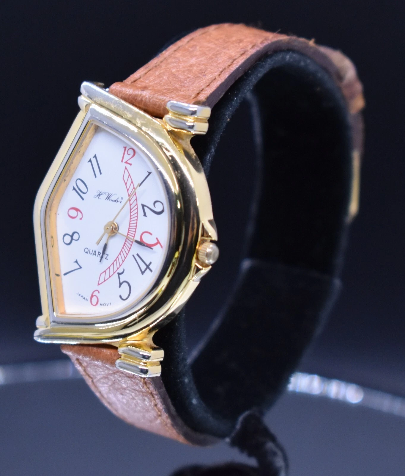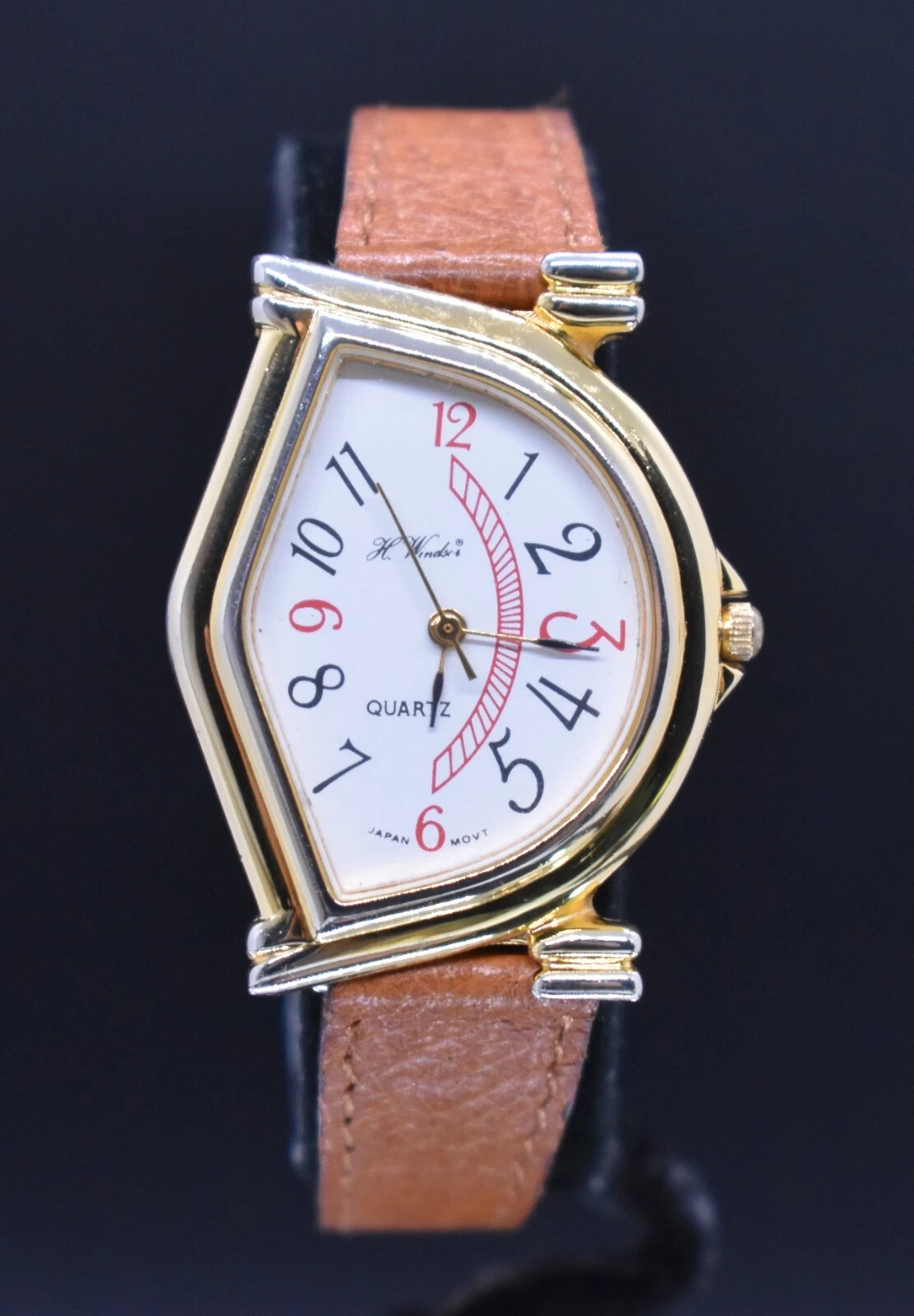 Vtg H WINDSOR Quartz Watch Women Half Moon Japan Leather NEW BATTERY