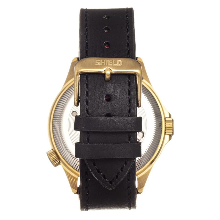 Gold-tone stainless steel case with a black genuine leather strap. Fixed gold-tone stainless steel bezel. Black dial with gold-tone sword-shaped hands and Arabic & index hour markers. Minute scale around the inner rim. Dial Type: Analog. Luminescent hands and markers. Date display at the 3 o'clock position. Quartz movement. Scratch resistant mineral crystal. Screw down crown. Solid case back. Round case shape, case size: 46 mm, case thickness: 15 mm. Band width: 22 mm, band length: 9.06 inches. Buckle clasp. Water resistant at 200 meters / 660 feet. Functions: date, hour, minute, second, rotating internal compass. Palau Series. Casual watch style. Watch label: Japan Movt. Shield Palau Quartz Black Dial Men's Watch SLDSH104-5.