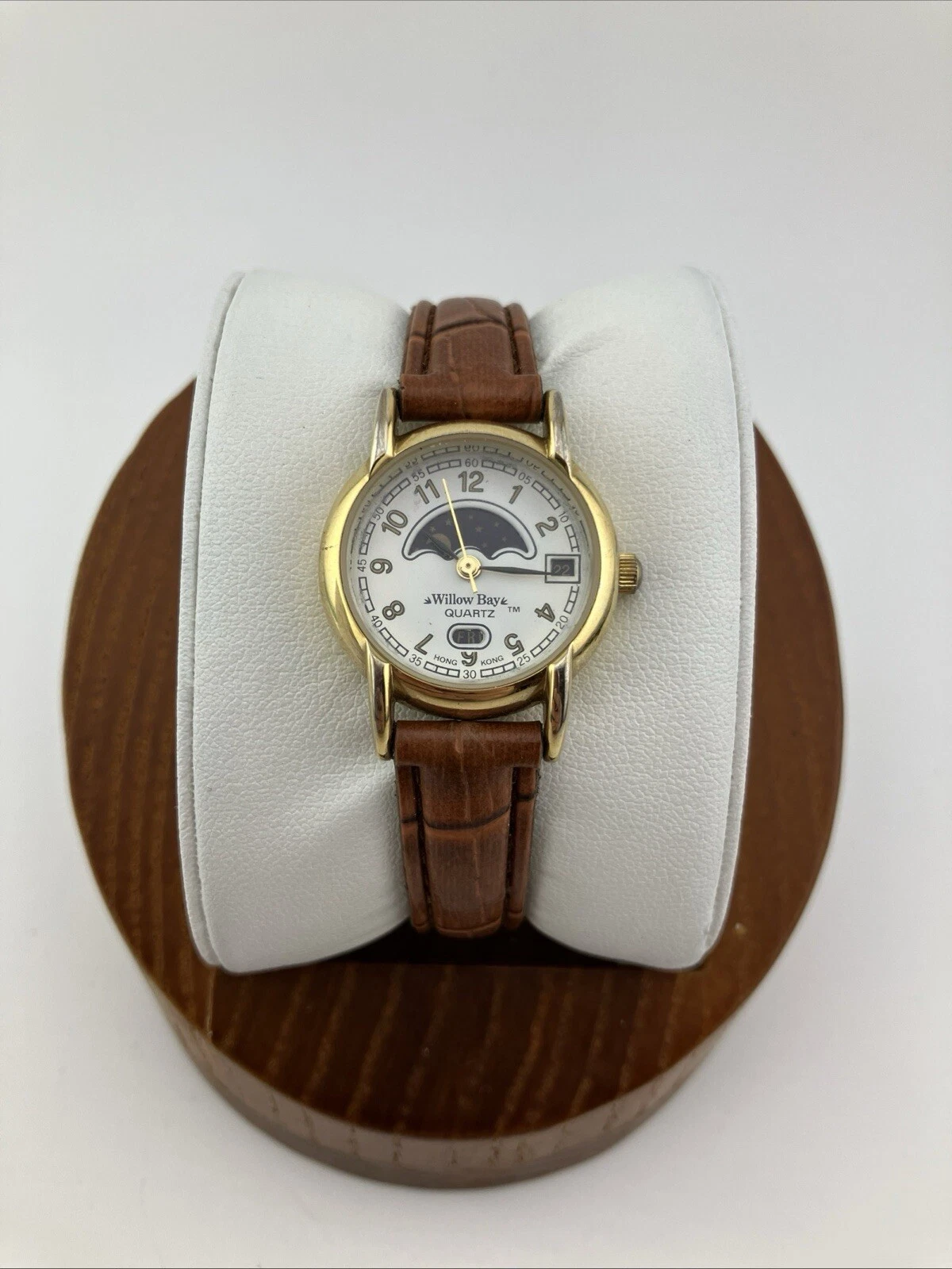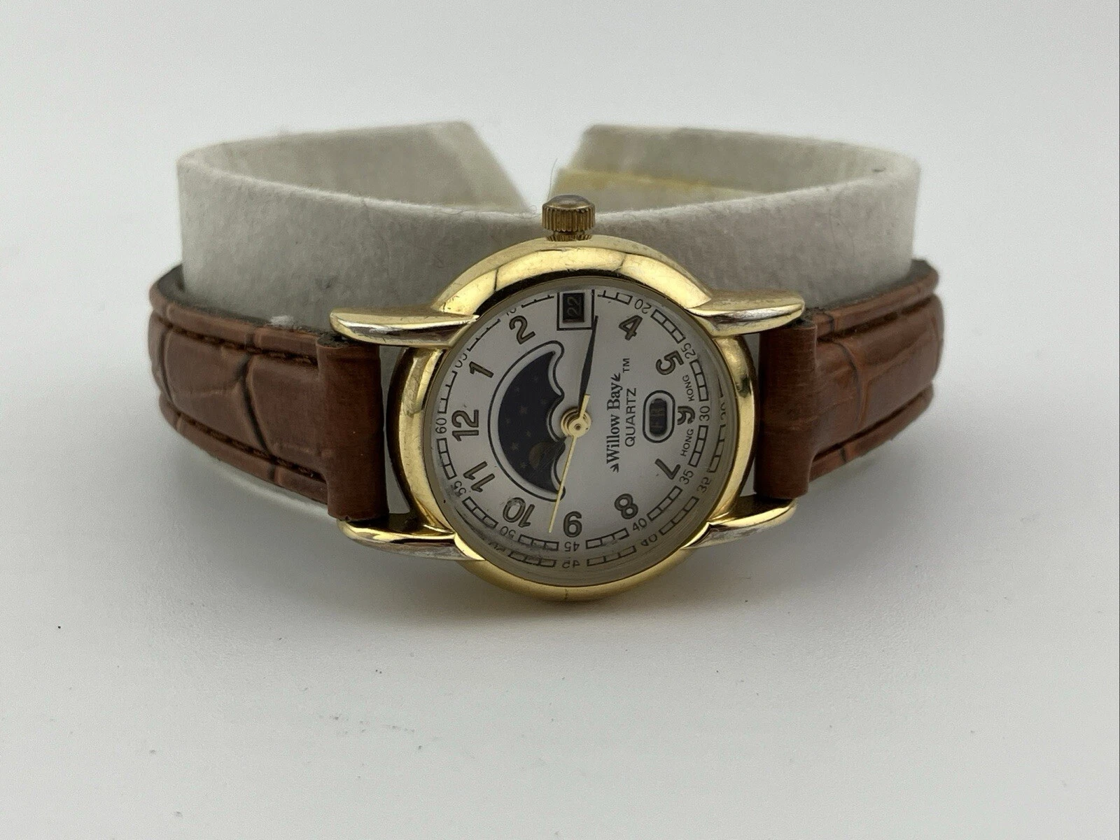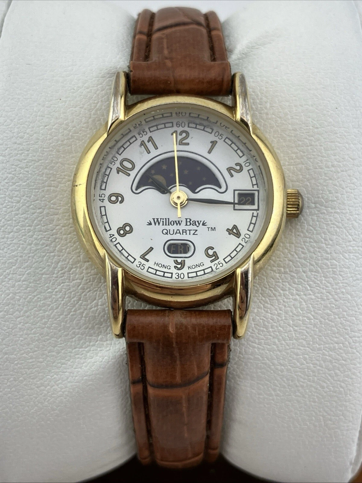 Vtg Willow Bay Ladies 25mm Watch Gold Tone Moonphase Day/Date - RUNS