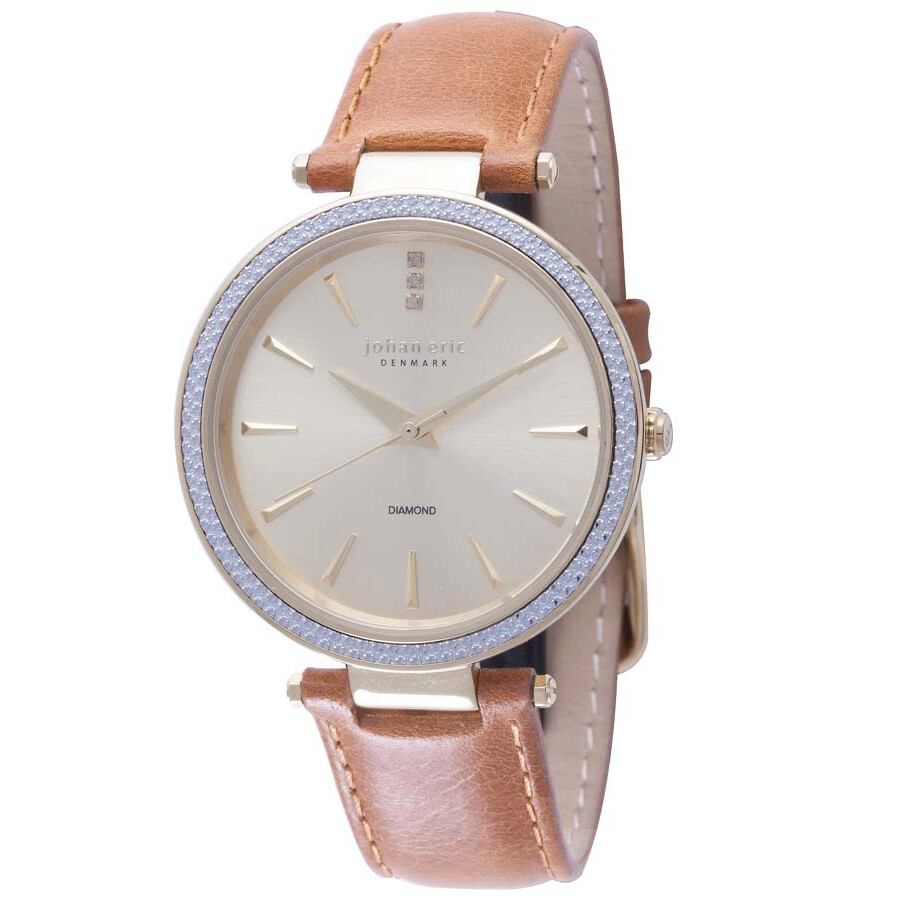 Gold-tone stainless steel case with a tan leather strap. Fixed gold-tone stainless steel bezel. Gold-tone dial with gold-tone hands and index hour markers. Dial Type: Analog. Quartz movement. Scratch resistant mineral crystal. Push/pull crown. Solid case back. Round case shape, case size: 36.75 mm, case thickness: 7 mm. Band width: 17.5 mm, band length: 7.5 in. Buckle clasp. Water resistant at 50 meters / 165 feet. Functions: hour, minute, second. Casual watch style. Johan Eric Fredericia Gold Dial Ladies Watch JE-F1000-02-002.
