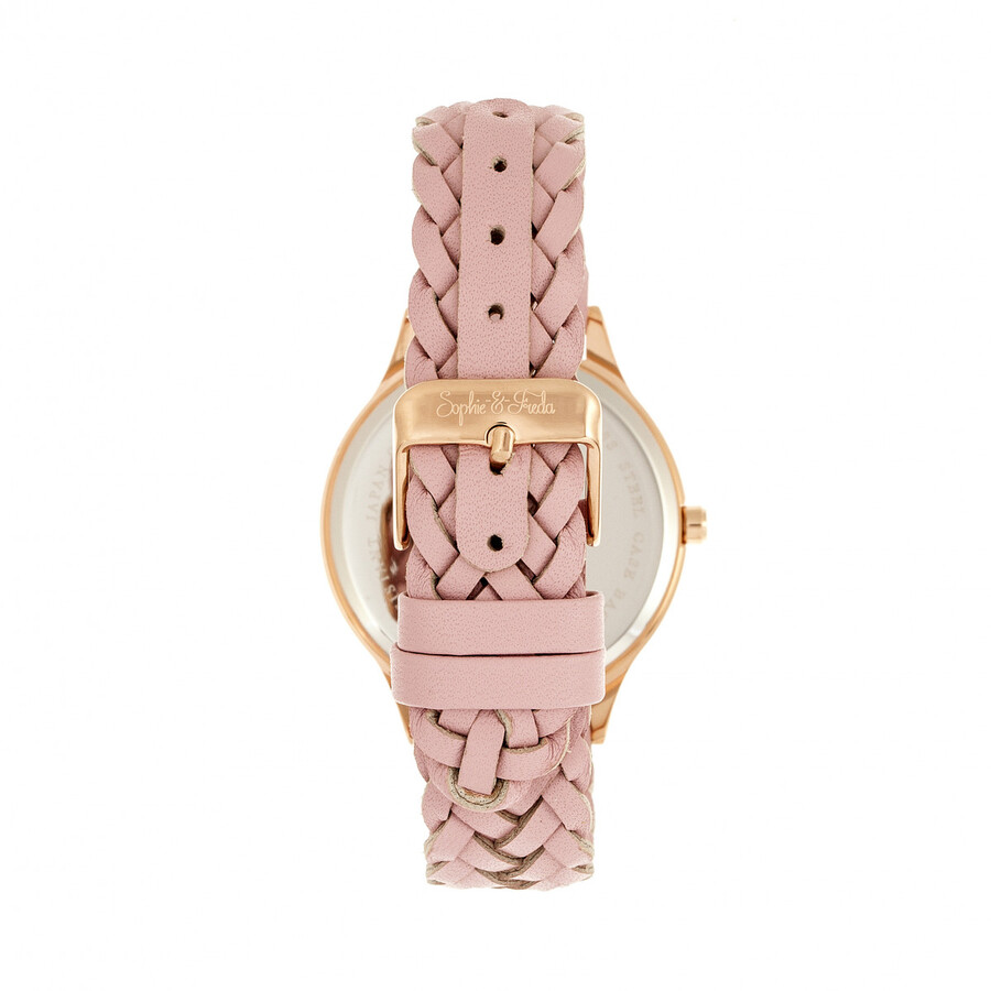 Rose gold-tone alloy case with a pink genuine leather strap. Fixed gold alloy bezel. Silver-tone dial with gold-tone hands. Dial Type: Analog. Quartz movement. Scratch resistant mineral crystal. Solid case back. Round case shape, case size: 36 mm, case thickness: 8 mm. Band width: 11 mm. Buckle clasp. Water resistant at 30 meters / 100 feet. Functions: hour, minute, second. Watch label: Japan Movt. Item Variations: SAFSF4506. Sophie And Freda Tucson Silver Dial Ladies Watch SF4506.