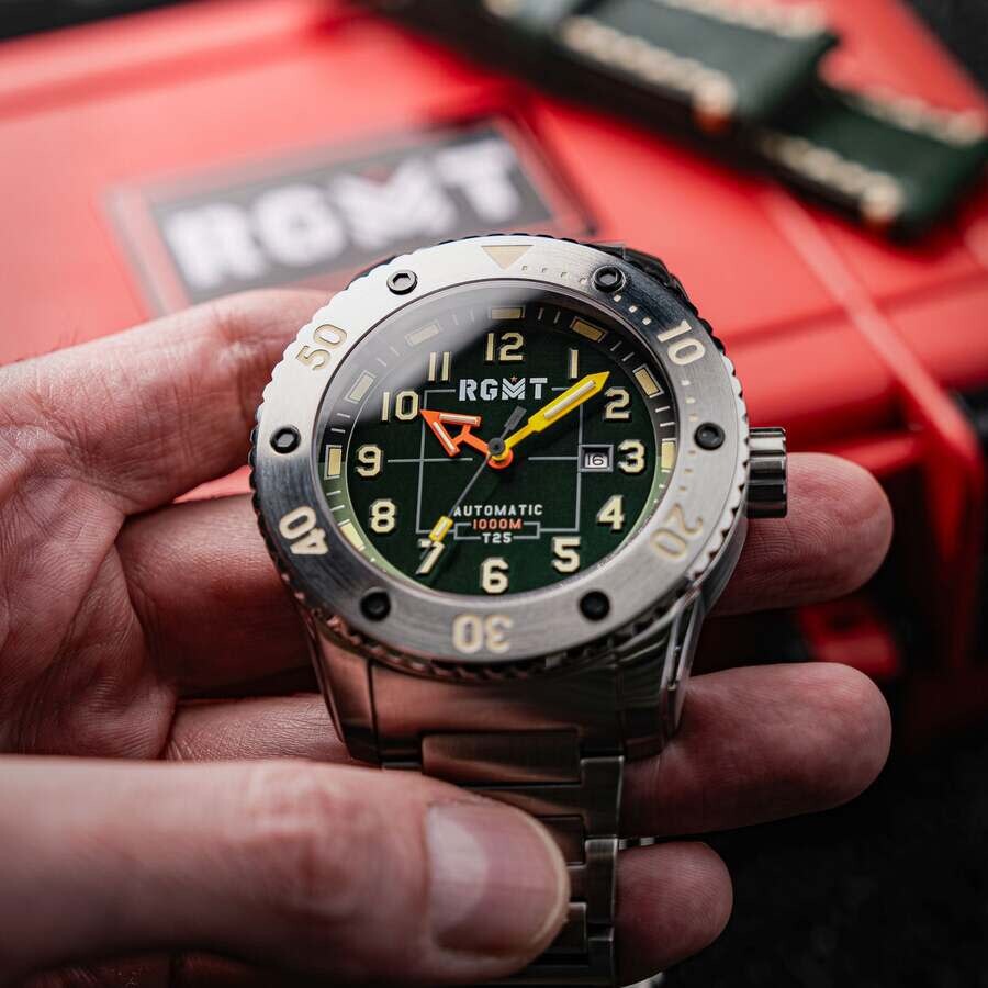 The All-Brite collection is back with a new iteration. The All-Brite Tritium Automatic collection offers the same exceptional 100 ATM water resistance and Japanese automatic movement. This new version furthers the luminous performance with tritium gas-powered lighting on the hands, giving you optimal visibility during your next adventure. Silver-tone stainless steel case and bracelet. Uni-directional rotating silver-tone stainless steel bezel. Green dial with black hands and Arabic numeral & index hour markers. Minute markers around the outer rim. Dial Type: Analog. Luminescent hands and markers. Date display at the 3 o'clock position. Miyota Caliber 8215 Automatic movement, containing 21 Jewels, bitting at 21600 vph, and has a power reserve of approximately 42 hours. Scratch resistant sapphire crystal. Screw down crown. Solid case back. Round case shape, case size: 54 mm, case thickness: 18 mm. Band width: 26 mm, band length: 8 inches. Fold over clasp. Water resistant at 100 meters / 330 feet. Functions: date, hour, minute, second. All-brite Tritium Series. Casual watch style. Watch label: Japan Movt. RGMT All-Brite Tritium Green Dial Men's Watch RG-8047-33.