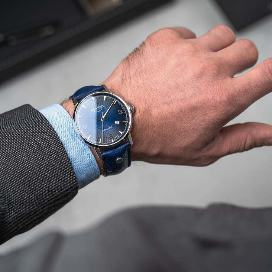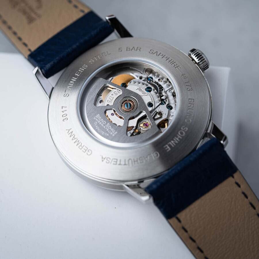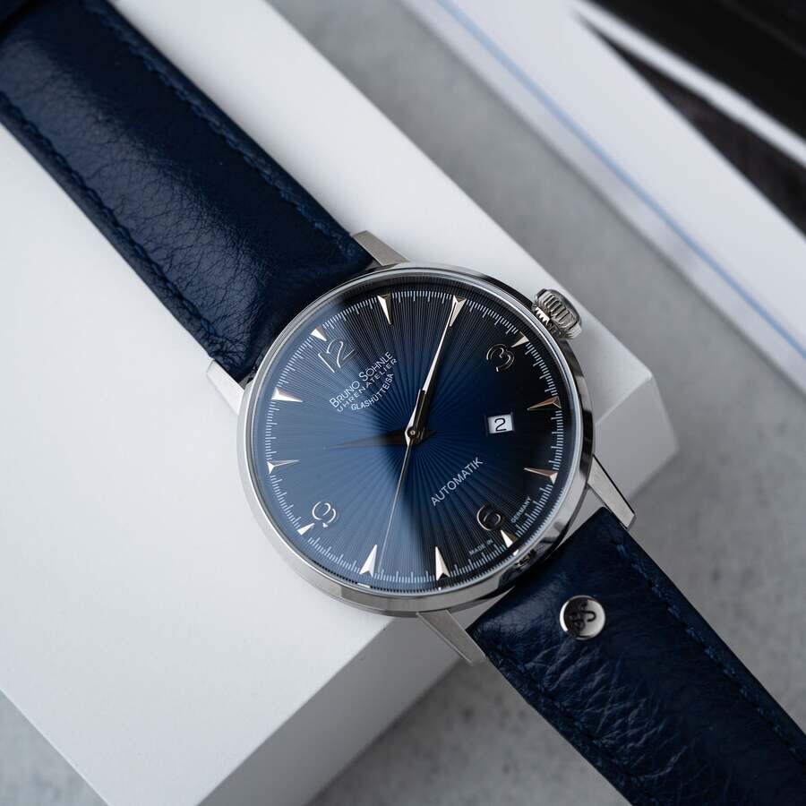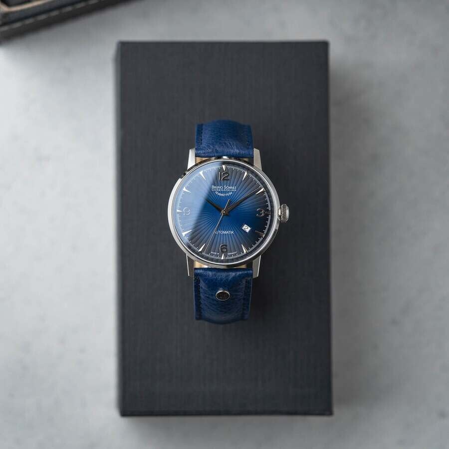 The Stuttgart model series is a tribute to the founder's Swabian homeland, Bruno Söhnle himself. Silver-tone stainless steel case with a blue calfskin band. Fixed silver-tone stainless steel bezel. Blue dial with silver-tone hands and Arabic numeral & index hour markers. Minute markers around the outer rim. Dial Type: Analog. Date display at the 4 o'clock position. Sellita Caliber SW200-1 Automatic movement, containing 26 Jewels, bitting at 28800 vph, and has a power reserve of approximately 38 hours. Scratch resistant sapphire crystal. Transparent case back. Round case shape, case size: 42 mm, case thickness: 10.8 mm. Band width: 22 mm. Buckle clasp. Water resistant at 50 meters / 165 feet. Functions: date, hour, minute, second. Stuttgart Series. Casual watch style. Bruno Sohnle Stuttgart Automatic Blue Dial Men's Watch 17-12173-361.