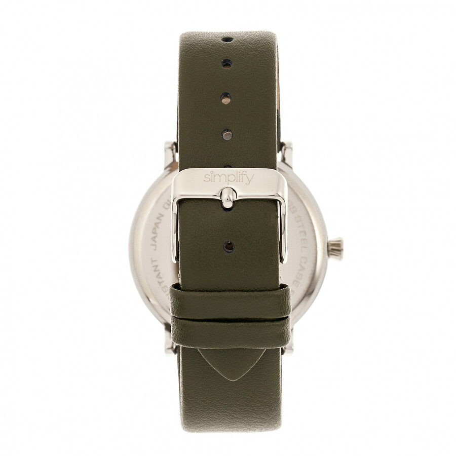 Silver-tone alloy case with a olive leather strap. Fixed silver-tone alloy bezel. White dial with silver-tone hands and index / Arabic numeral hour markers. Minute markers. Dial Type: Analog. Quartz movement. Scratch resistant mineral crystal. Pull / push crown. Solid case back. Round case shape. Case size: 39 mm. Case thickness: 8 mm. Band width: 20 mm. Buckle clasp. Water resistant at 30 meters / 100 feet. Functions: hour, minute, second. Casual watch style. Watch label: Japan Movt. Simplify The 6200 White Dial Watch SIM6201.