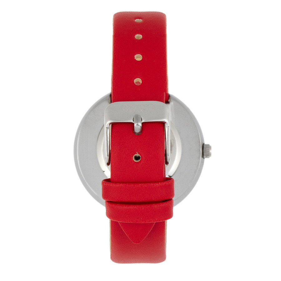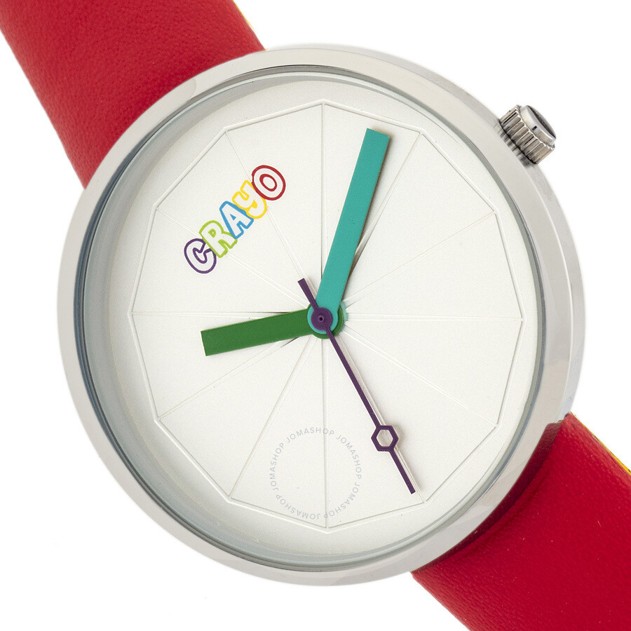 Silver-tone alloy case with a red leatherette strap. Fixed silver-tone alloy bezel. Silver dial with green and turquoise hands. No markers. Dial Type: Analog. Quartz movement. Scratch resistant mineral crystal. Pull / push crown. Solid case back. Round case shape. Case size: 38 mm. Case thickness: 9 mm. Band width: 16 mm, band length: 8 inches. Tang clasp. Water resistant at 30 meters / 100 feet. Functions: hour, minute, second. Metric Series. Casual watch style. Crayo Metric Quartz Silver Dial Unisex Watch CRACR5802.