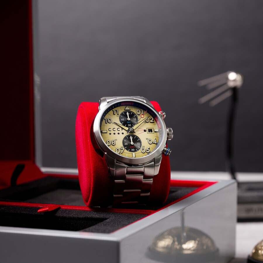 Silver-tone stainless steel case and bracelet. Fixed silver-tone stainless steel bezel. Beige dial with black hands and Arabic numeral & index hour markers. Minute markers around the outer rim. Dial Type: Analog. Luminescent hands and markers. Date display at the 3 o'clock position. Chronograph - two sub-dials displaying: 60 second and 30 minute. Quartz movement. Scratch resistant mineral crystal. Solid case back. Round case shape, case size: 44 mm, case thickness: 13 mm. Band width: 22 mm, band length: 8 inches. Fold over clasp with a safety release. Functions: chronograph, date, hour, minute, second. Sputnik Chronograph Series. Fashion watch style. CCCP Sputnik Chronograph Quartz Men's Watch CP-7098-22.