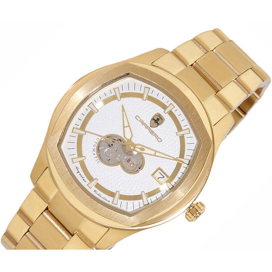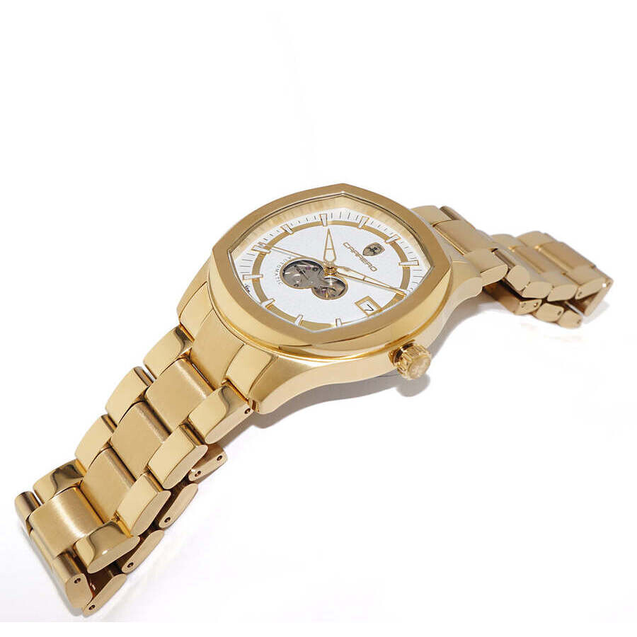 Yellow gold-tone stainless steel case and bracelet. Fixed yellow gold-tone stainless steel bezel. White dial with yellow gold-tone hands and index hour markers. Minute scale around the inner rim. Dial Type: Analog. Luminescent hands and markers. Date display at the 3 o'clock position. SII Caliber NH35A Automatic movement, containing 24 Jewels, bitting at 21600 vph, and has a power reserve of approximately 41 hours. Scratch resistant mineral crystal. Pull / push crown. Transparent case back. Round case shape, case size: 42 mm, case thickness: 12.25 mm. Band width: 22 mm, band length: 7.5 inches. Deployment with push button release clasp. Water resistant at 50 meters / 165 feet. Functions: date, hour, minute, second. Additional Info: sunray dial with heart beat - 24 jewel automatic. Aequilux Series. Casual watch style. Watch label: Japan Movt. Torino Carrero Aequilux Automatic White Dial Men's Watch C1G1875-WT.