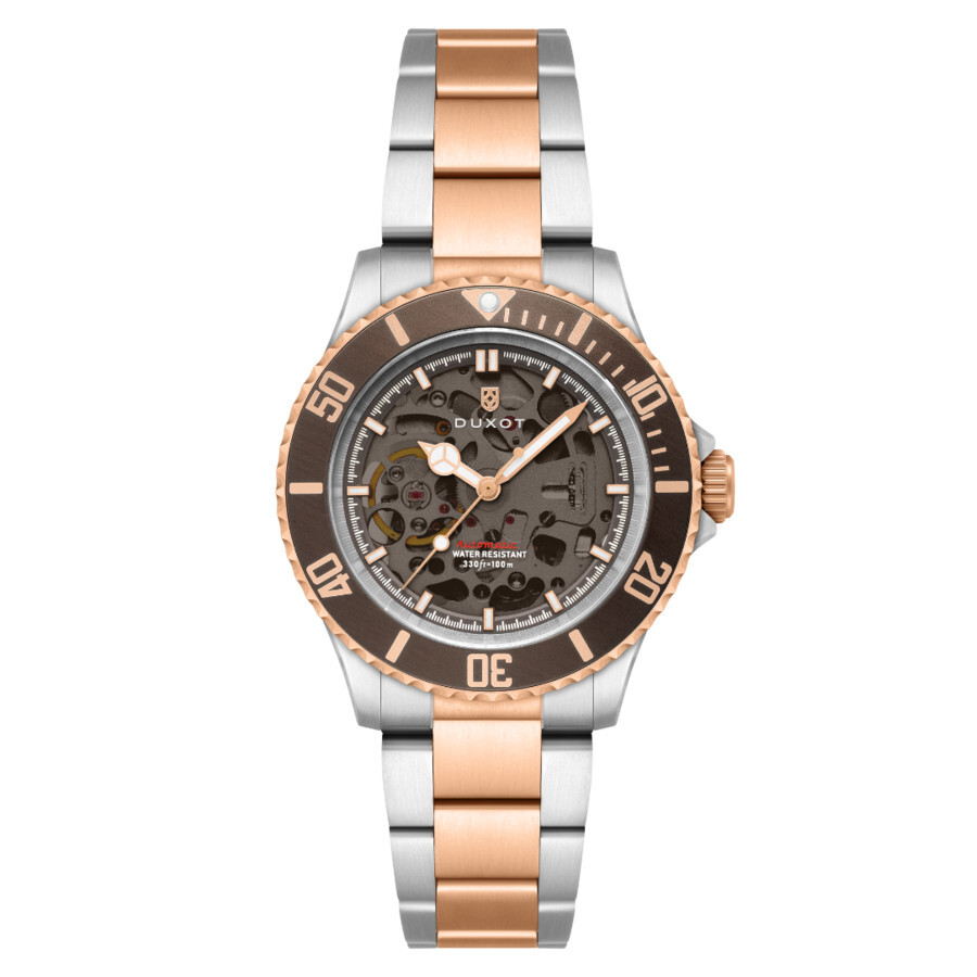 The Atlantica Skeleton Automatic redefines the classic dive watch with a modern twist. Featuring the NH70 automatic skeletonized movement, the transparent dial proudly displays its intricate inner workings. With water-resistant up to 100 meters, this watch is not only a stylish accessory but also a reliable companion for all your adventures. Silver-tone stainless steel case with a two-tone (silver-tone and rose gold-tone) stainless steel bracelet. Uni-directional rotating brown stainless steel bezel. Brown dial with rose gold-tone hands and index hour markers. Minute markers around the outer rim. Dial Type: Analog. Luminescent hands and markers. SII Caliber NH70A Automatic movement, containing 24 Jewels, bitting at 21600 vph, and has a power reserve of approximately 41 hours. Scratch resistant sapphire crystal. Pull / push crown. Transparent case back. Round case shape, case size: 40 mm, case thickness: 13 mm. Band width: 20 mm, band length: 8 inches. Fold over clasp with a safety release. Water resistant at 100 meters / 330 feet. Functions: hour, minute, second. Atlantica Series. Casual watch style. Watch label: Japan Movt. Duxot Atlantica Automatic Brown Dial Men's Watch DX-2067-66.