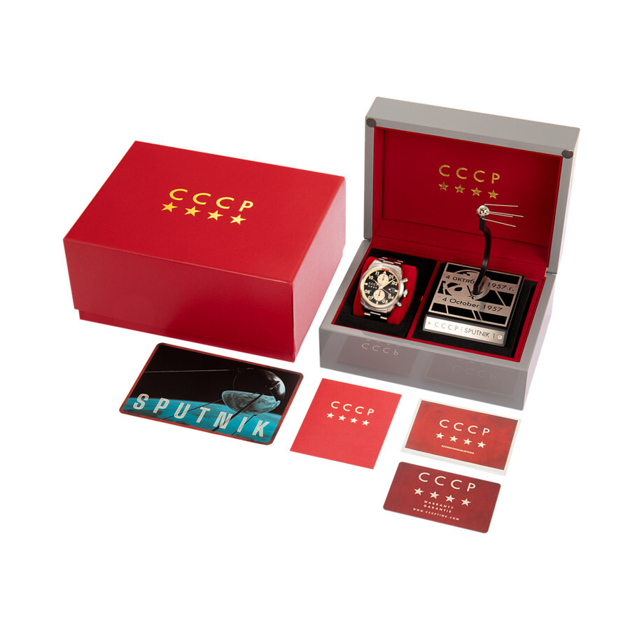 Silver-tone stainless steel case and bracelet. Fixed silver-tone stainless steel bezel. Black dial with silver-tone hands and Arabic numeral & index hour markers. Minute markers around the outer rim. Dial Type: Analog. Luminescent hands and markers. Date display at the 3 o'clock position. Chronograph - two sub-dials displaying: 60 second and 30 minute. Quartz movement. Scratch resistant mineral crystal. Solid case back. Round case shape, case size: 44 mm, case thickness: 13 mm. Band width: 22 mm, band length: 8 inches. Fold over clasp with a safety release. Functions: chronograph, date, hour, minute, second. Sputnik Chronograph Series. Fashion watch style. CCCP Sputnik Chronograph Quartz Black Dial Men's Watch CP-7098-11.