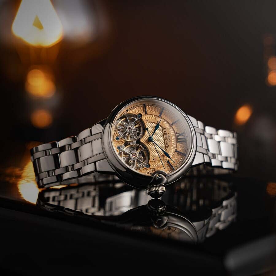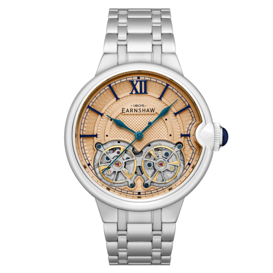 Incredibly refined. The double barrel open heart automatic display is a true piece of engineered, wearable art. Beyond the ordinary, beyond what is expected of a timepiece, this is a timepiece of incredible sophistication reflecting the talents, the tradition and timeless luxury of the Earnshaw brand. Silver-tone stainless steel case and bracelet. Fixed silver-tone stainless steel bezel. Gold-tone dial with blue hands and index hour markers. Minute markers around the outer rim. Dial Type: Analog. PTS - S01-1 automatic movement. Scratch resistant mineral crystal. Pull / push crown. Transparent case back. Round case shape, case size: 42 mm, case thickness: 16 mm. Band width: 20 mm, band length: 8 inches. Fold over clasp with a safety release. Water resistant at 3 meters / 10 feet. Functions: hour, minute, second. Barallier Dual Open Heart Series. Casual watch style. Thomas Earnshaw Barallier Dual Open Heart Automatic Gold Dial Men's Watch ES-8266-66.