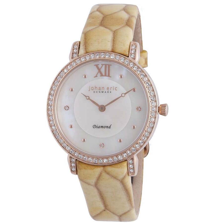 Rose gold-tone stainless steel case with a yellow leather strap. Fixed rose gold-tone stainless steel bezel. with rose gold-tone hands and index hour markers. Dial Type: Analog. Quartz movement. Scratch resistant mineral crystal. Push/pull crown. Solid case back. Round case shape, case size: 35 mm, case thickness: 6.5 mm. Band width: 16 mm, band length: 7.5 in. Buckle clasp. Water resistant at 30 meter / 99 feet. Functions: hour, minute. Casual watch style. Johan Eric Ribe Ladies Watch JE7000-09-009.09.