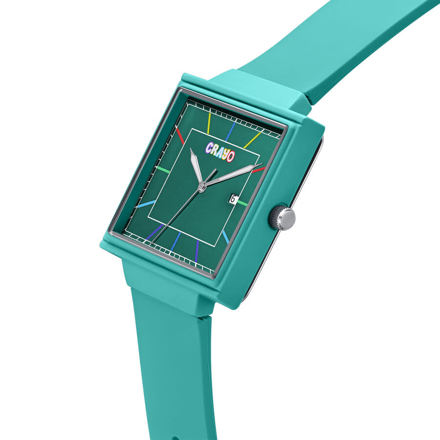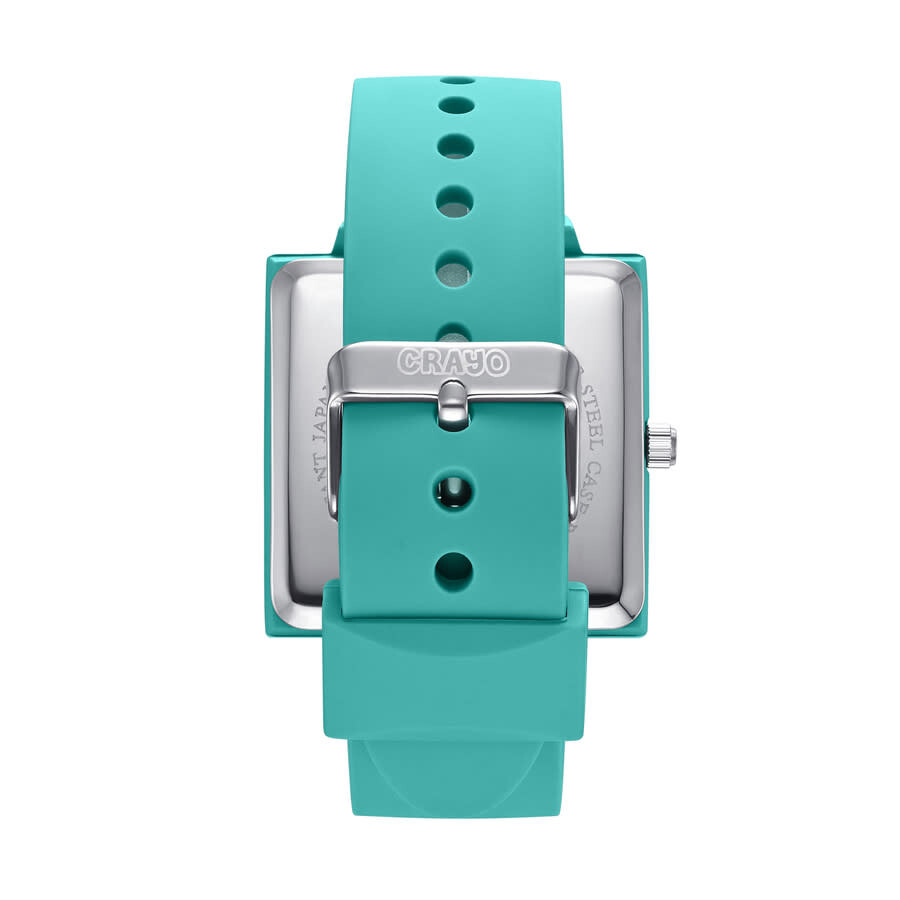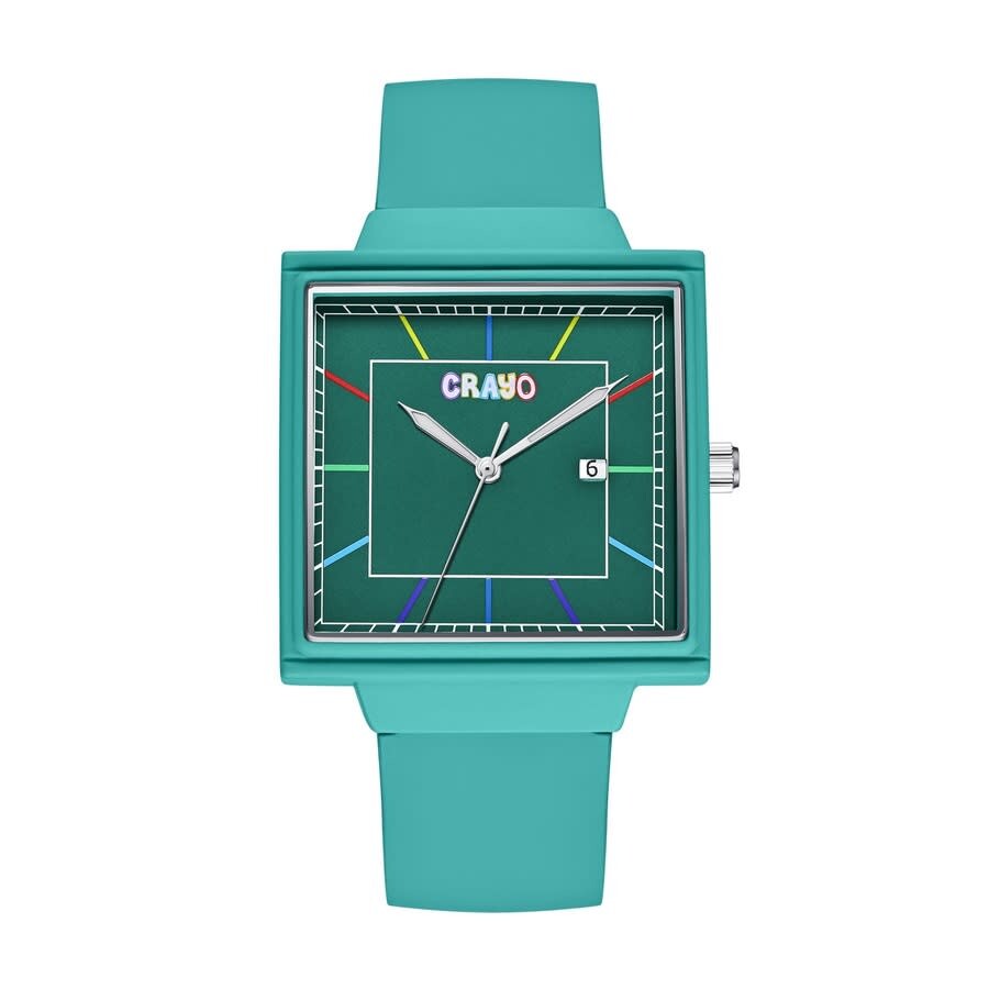 Green stainless steel case with a green genuine leather strap. Fixed green stainless steel bezel. Green dial with silver-tone hands and index hour markers. Minute markers around the outer rim. Dial Type: Analog. Luminescent hands. Date display at the 3 o'clock position. Quartz movement. Pull / push crown. Square case shape, case size: 38 mm. Water resistant at 50 meters / 165 feet. Functions: date, hour, minute, second. Dream Series. Casual watch style. Watch label: Japan Movt. Crayo Dream Quartz Green Dial Unisex Watch CRACR6005.