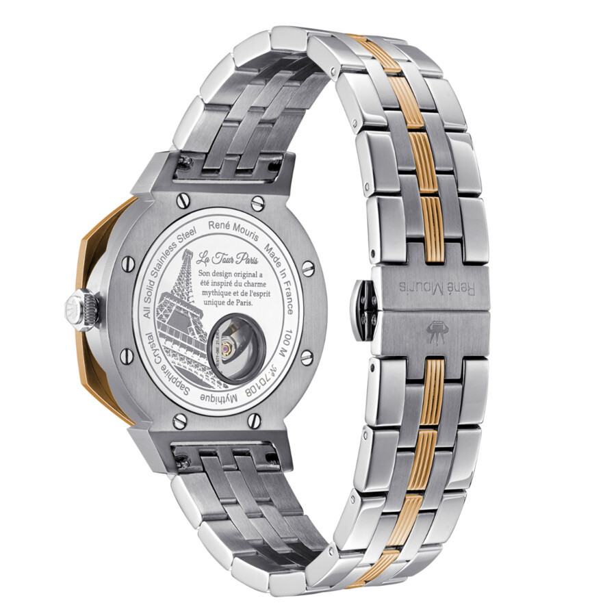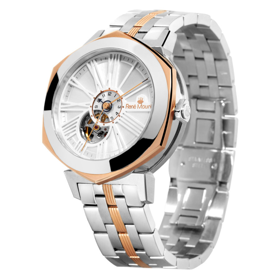 Stainless steel case with a two-tone (silver-tone and rose gold-tone) stainless steel bracelet. Fixed stainless steel bezel. Silver (open heart) dial with rose gold-tone hands and Roman numeral / small Arabic numeral hour markers. Minute markers around the outer rim. Dial Type: Analog. Automatic movement. Scratch resistant sapphire crystal. Pull / push crown. Transparent case back. Round case shape. Case size: 43 mm. Case thickness: 13 mm. Band width: 20 mm. Band length: 8.5 inches. Deployment clasp with a push button release. Water resistant at 10 meters / 33 feet. Functions: atomic watch, GMT. Mythique Series. Fashion watch style. Watch label: Japan Movt. Rene Mouris Mythique GMT Silver-tone Dial Men's Watch 70108RM3.