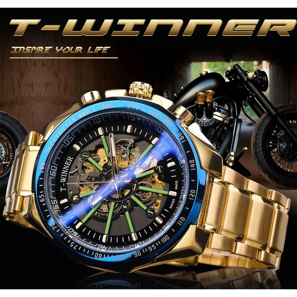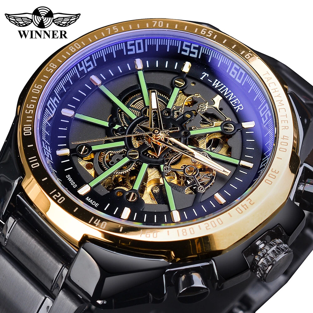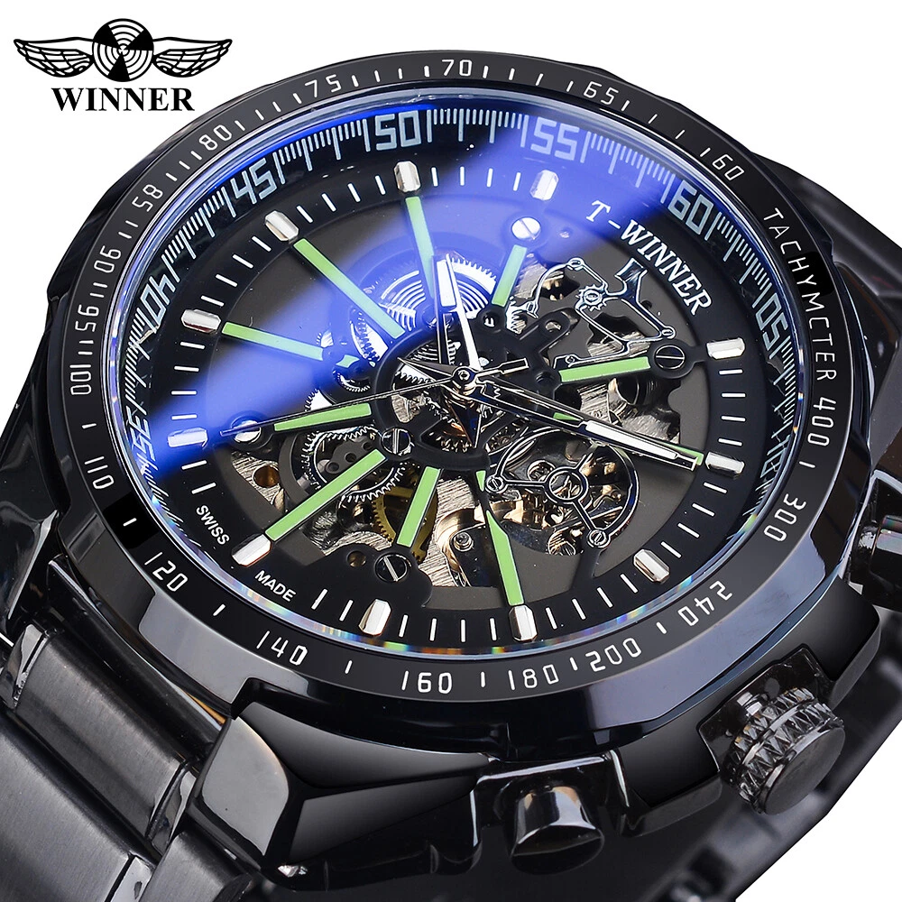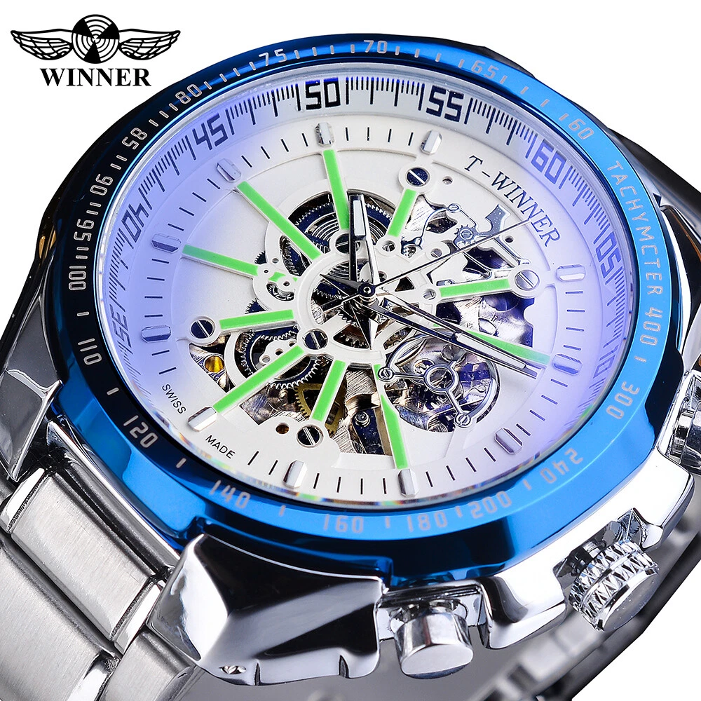 T-Winner Luxury Men's Stainless Steel Luminous Glass Mechanical Skeleton Watch