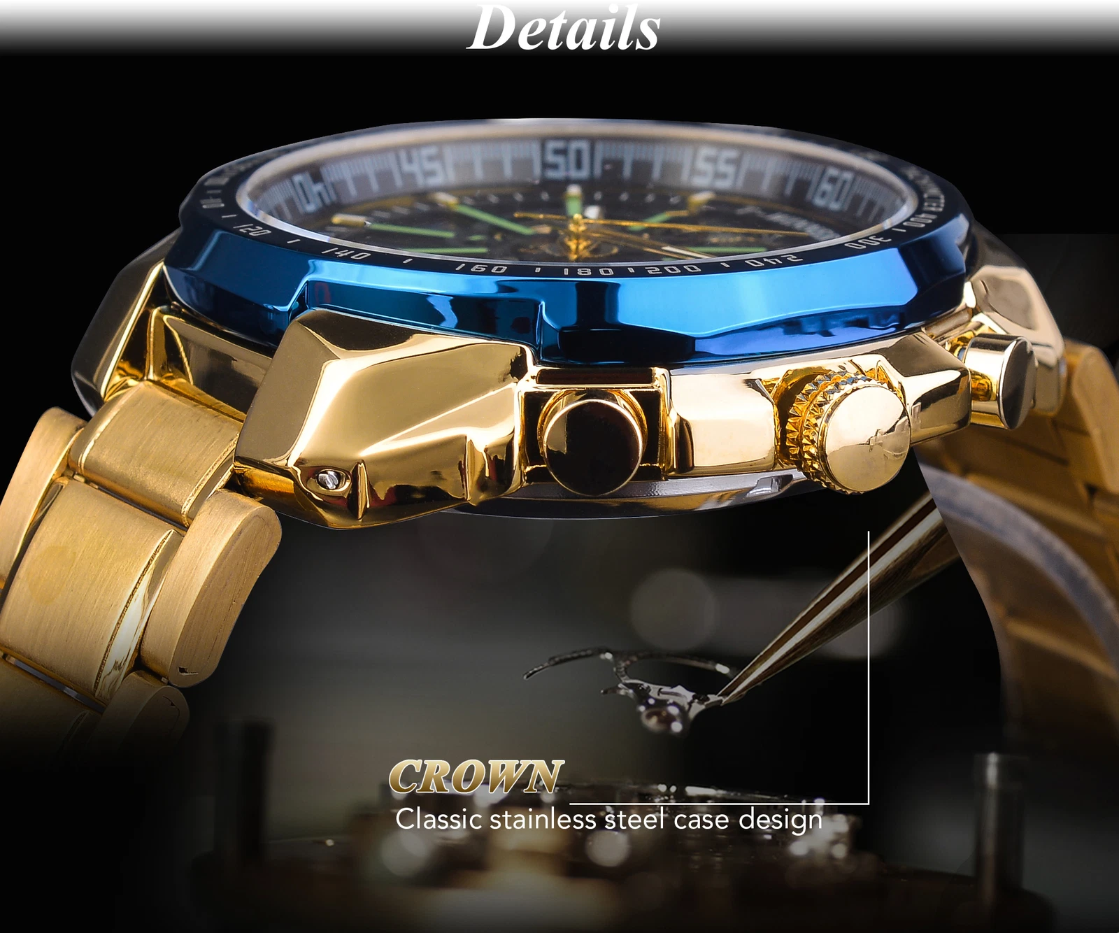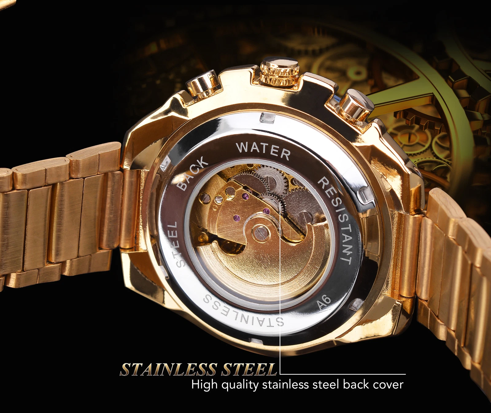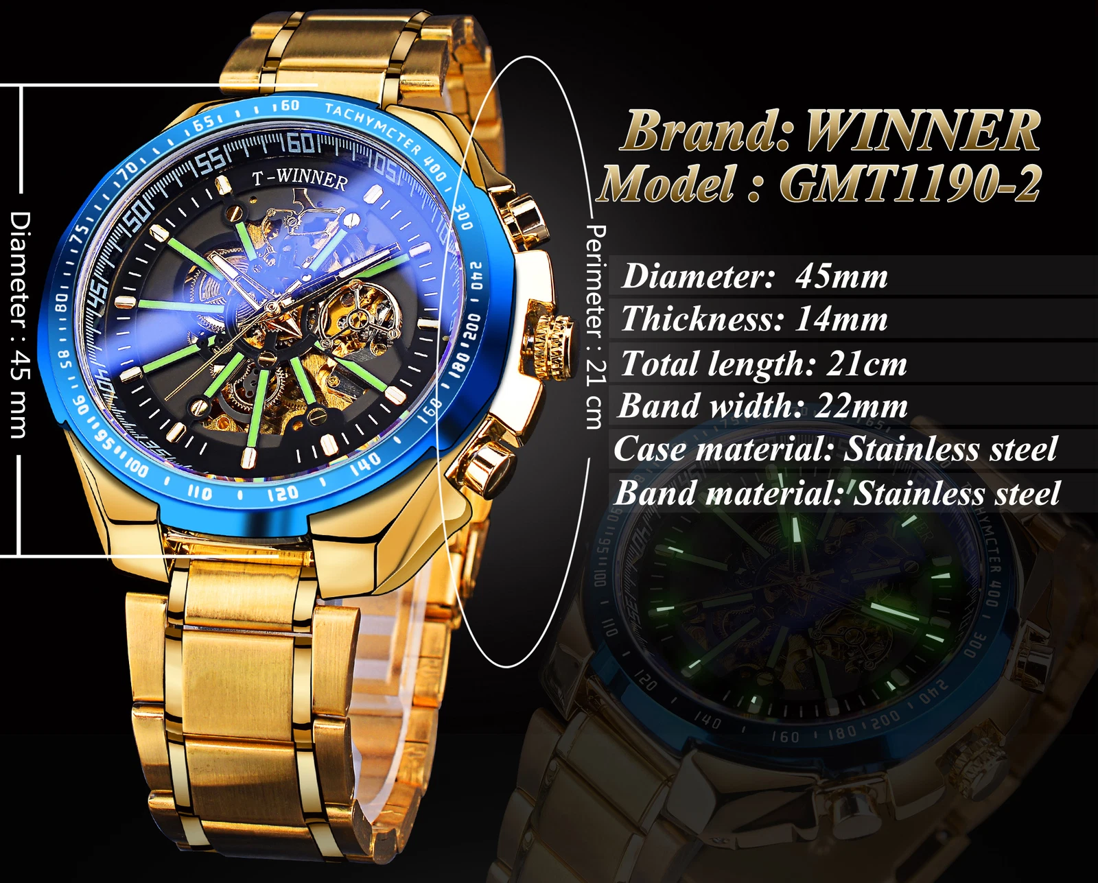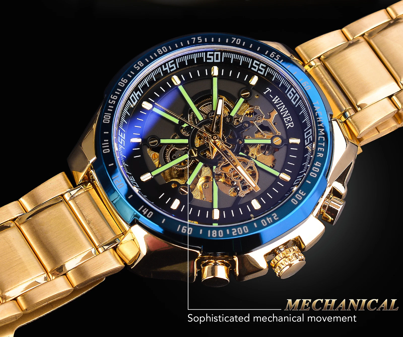 T-Winner Luxury Men's Stainless Steel Luminous Glass Mechanical Skeleton Watch