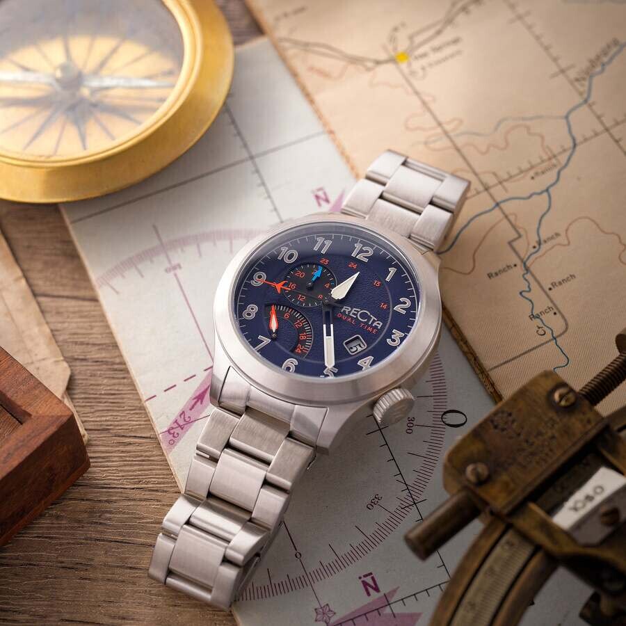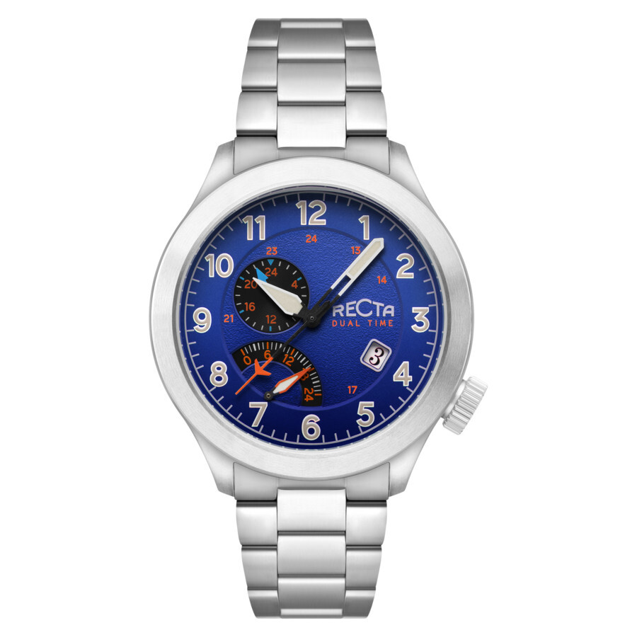 The Altitude Retrograde offers classic style and modern precision. Its Japanese quartz retrograde movement ensures accurate timekeeping, and the 46mm case diameter provides an elegant silhouette. The date display offers a convenience that will come in handy for daily use. Silver-tone stainless steel case and bracelet. Fixed silver-tone stainless steel bezel. Blue dial with silver-tone hands and Arabic numeral hour markers. Minute markers around the outer rim. Dial Type: Analog. Luminescent hands and markers. Date display at the 4 o'clock position. Two sub-dials displaying: 24 hour and retrograde 24 hour. Miyota Caliber GP03 quartz movement. Scratch resistant mineral crystal. Pull / push crown. Solid case back. Round case shape, case size: 46 mm, case thickness: 13 mm. Band width: 22 mm, band length: 8 inches. Fold over clasp with a safety release. Water resistant at 50 meters / 165 feet. Functions: retrograde, big date, GMT, second time zone, hour, minute, second. Altitude Series. Casual watch style. Watch label: Japan Movt. Recta Altitude GMT Quartz Blue Dial Men's Watch RT-3007-66.