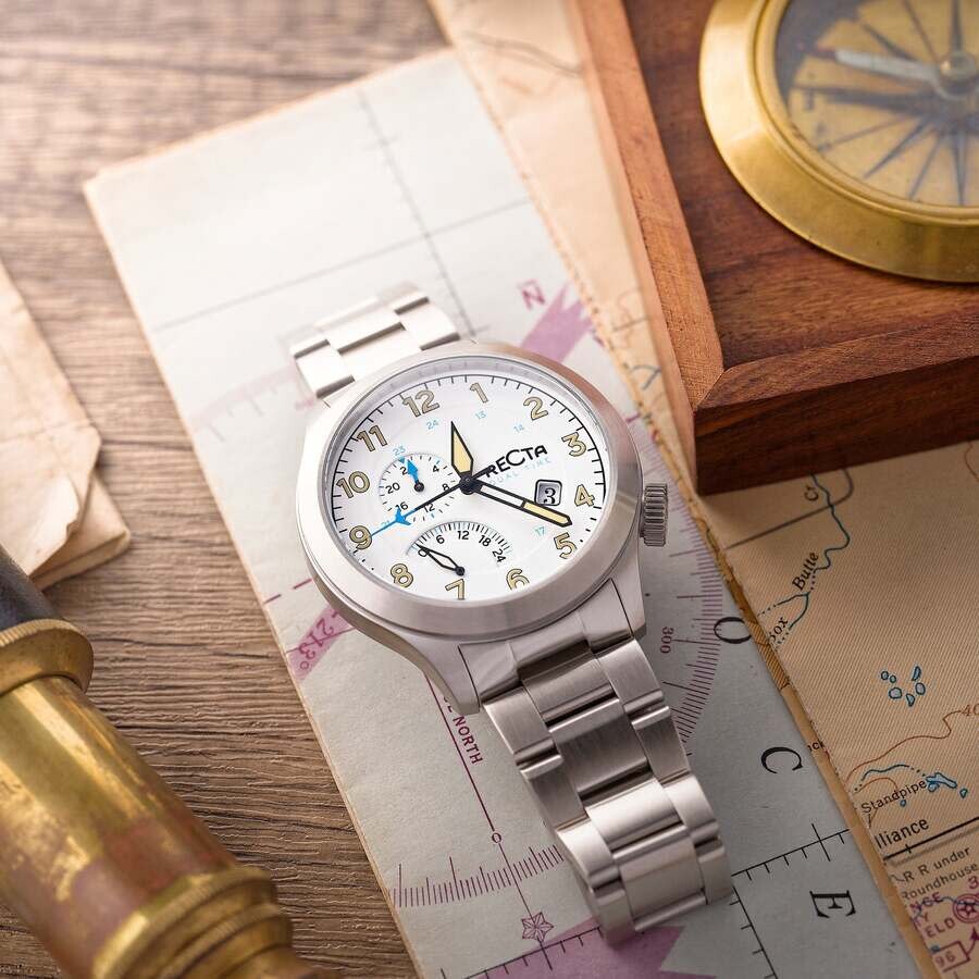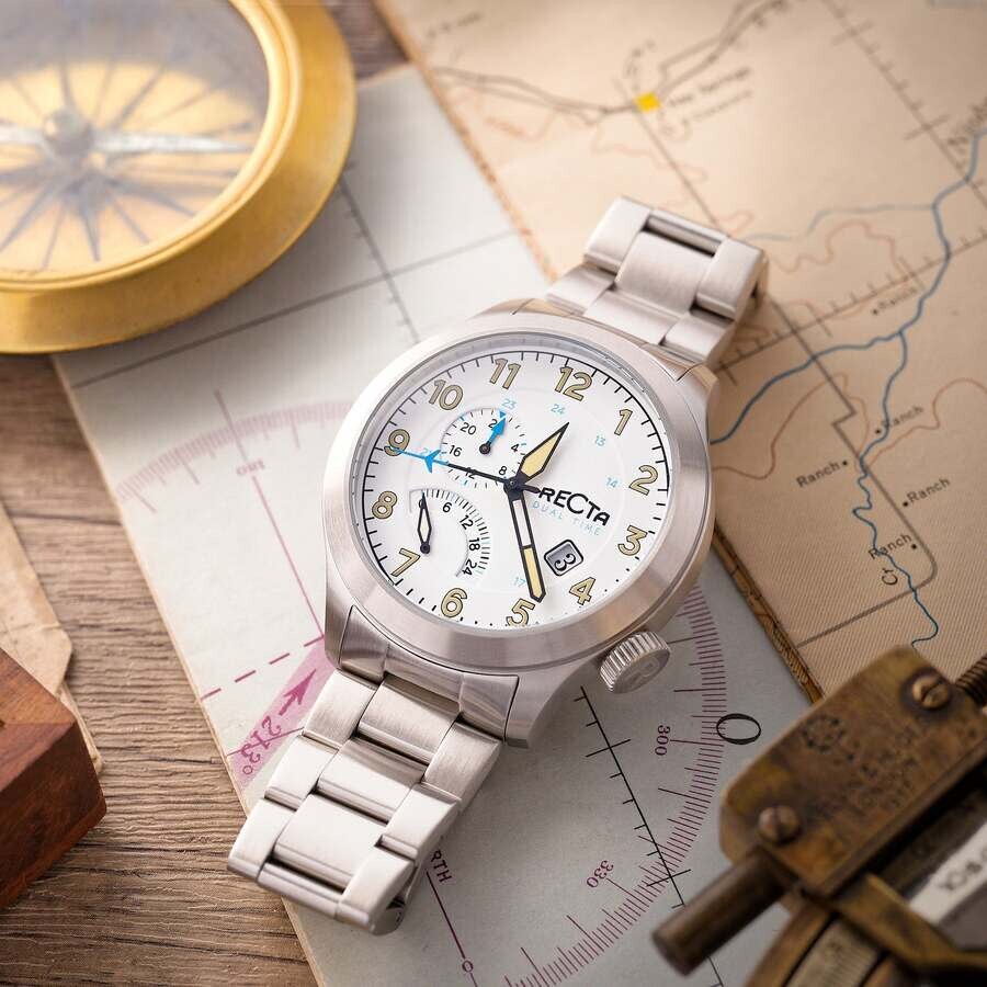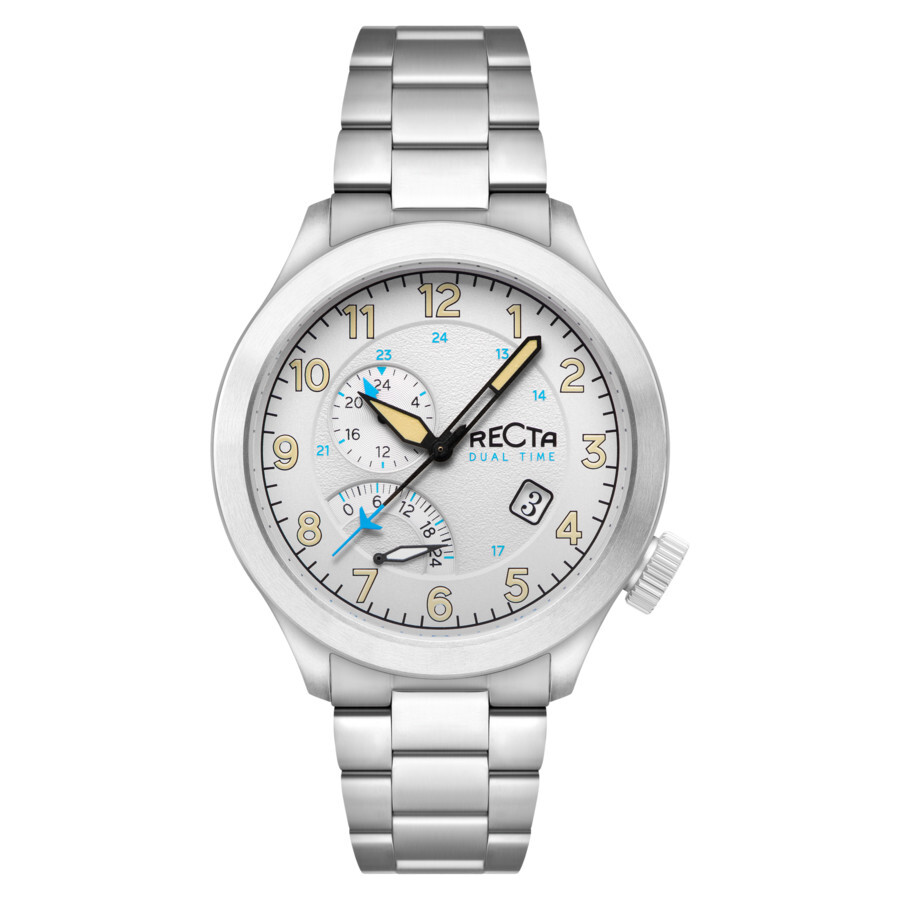 The Altitude Retrograde offers classic style and modern precision. Its Japanese quartz retrograde movement ensures accurate timekeeping, and the 46mm case diameter provides an elegant silhouette. The date display offers a convenience that will come in handy for daily use. Silver-tone stainless steel case and bracelet. Fixed silver-tone stainless steel bezel. White dial with black hands and Arabic numeral hour markers. Minute markers around the outer rim. Dial Type: Analog. Luminescent hands and markers. Date display at the 4 o'clock position. Two sub-dials displaying: 24 hour and retrograde 24 hour. Miyota Caliber GP03 quartz movement. Scratch resistant mineral crystal. Pull / push crown. Solid case back. Round case shape, case size: 46 mm, case thickness: 13 mm. Band width: 22 mm, band length: 8 inches. Fold over clasp with a safety release. Water resistant at 50 meters / 165 feet. Functions: retrograde, big date, GMT, second time zone, hour, minute, second. Altitude Series. Casual watch style. Watch label: Japan Movt. Recta Altitude GMT Quartz White Dial Men's Watch RT-3007-88.