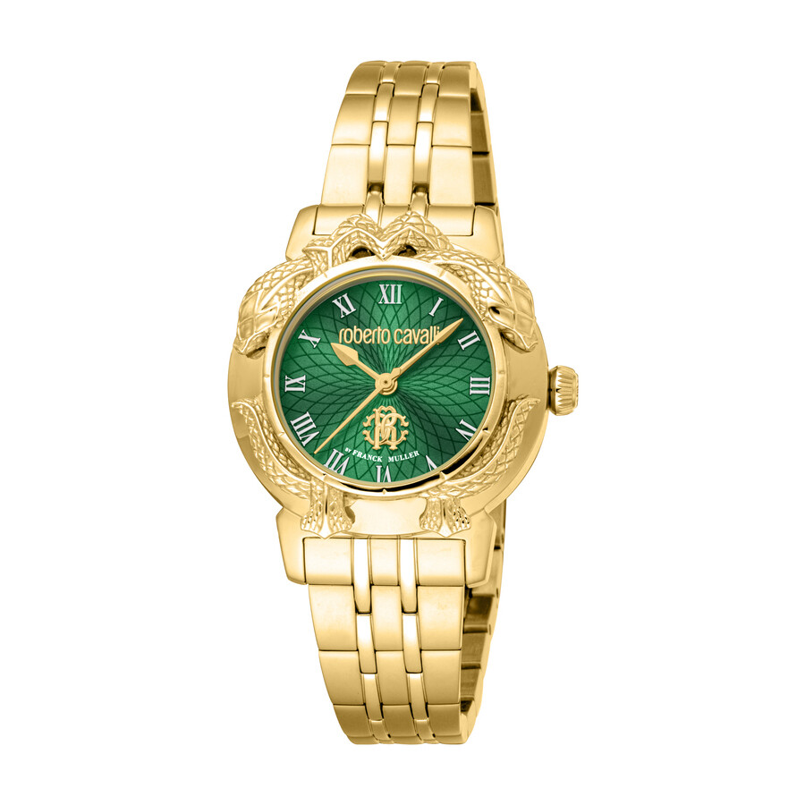 Yellow gold-tone stainless steel case and bracelet. Fixed yellow gold-tone stainless steel bezel. Green dial with yellow gold-tone hands and Roman numeral hour markers. Dial Type: Analog. Quartz movement. Scratch resistant sapphire crystal. Round case shape, case size: 32 mm. Fold over clasp with a safety release. Water resistant at 50 meters / 165 feet. Functions: hour, minute, second. Fashion Watch Series. Fashion watch style. Watch label: Swiss Made. Roberto Cavalli Fashion Watch Quartz Green Dial Ladies Watch RV1L227M0061.