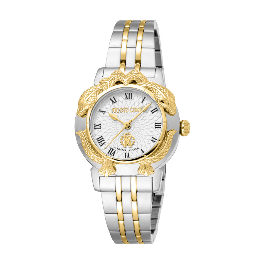 Silver-tone stainless steel case with a two-tone (silver-tone and yellow gold-tone) stainless steel bracelet. Fixed yellow gold-tone stainless steel bezel. Silver-tone dial with yellow gold-tone hands and Roman numeral hour markers. Dial Type: Analog. Quartz movement. Scratch resistant sapphire crystal. Round case shape, case size: 32 mm. Fold over clasp with a safety release. Water resistant at 50 meters / 165 feet. Functions: hour, minute, second. Fashion Watch Series. Fashion watch style. Watch label: Swiss Made. Roberto Cavalli Fashion Watch Quartz Silver Dial Ladies Watch RV1L227M0081.